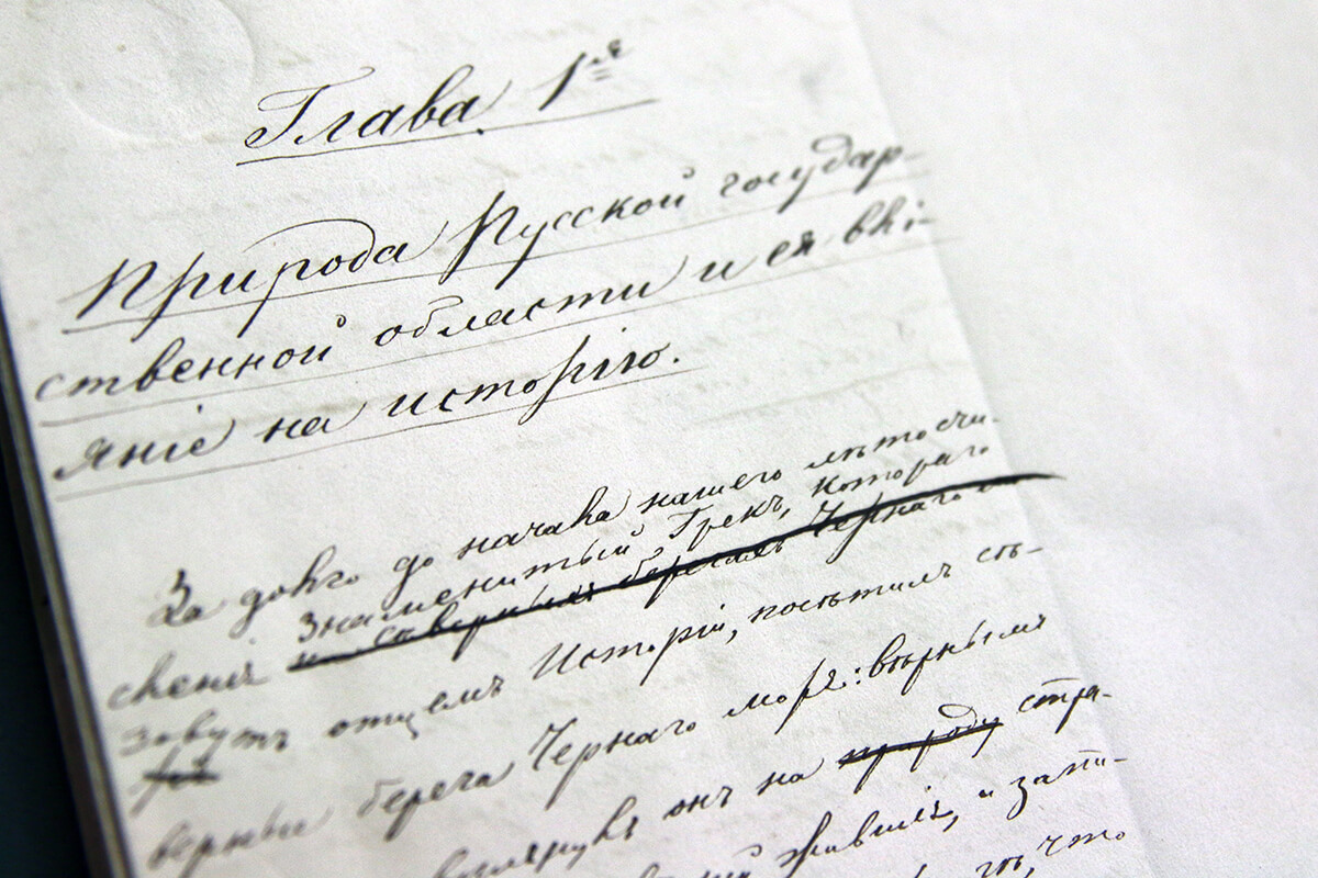 На выставке представлены творческие рукописи из личного архива Сергея Михайловича Соловьёва: автограф одного из томов «Истории России с древнейших времён», тетради лекций по древней русской истории, автограф «Публичных чтений о Петре Великом», проходивших в 1872 году в Политехническом музее, статьи: «В века незапамятные, покрытые мраком неизвестности…», «Наблюдения над исторической жизнью народов», программы по кафедре русской истории для