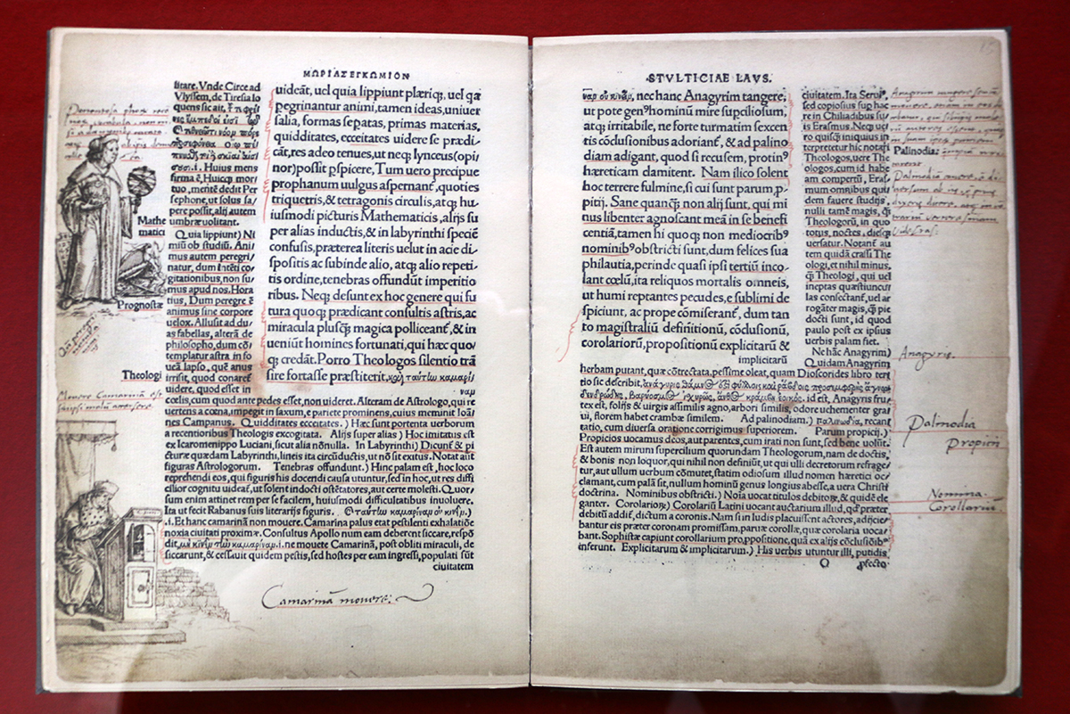Впрочем, если ты большой художник, твои рисунки на полях могут сделать книгу ещё более ценной. Так произошло с «Похвалой глупости» Эразма Роттердамского, изданной в Базеле в 1515 году. Экземпляр принадлежал другу автора, Освальду Микониусу (1488–1552), швейцарскому богослову и педагогу. История умалчивает, как книга попала к художнику Гансу Гольбейну Младшему (1497–1543), но именно он сделал на её полях рисунки пером. Его иллюстрации так оживили и украсили экземпляр, что в дальнейшем «Похвалу глупости» издавали уже с рисунками Ганса Гольбейна Младшего. Факсимильное воспроизведение разрисованного экземпляра, оригинал которого хранится в Базельском художественном музее, можно увидеть в экспозиции Музея книги.