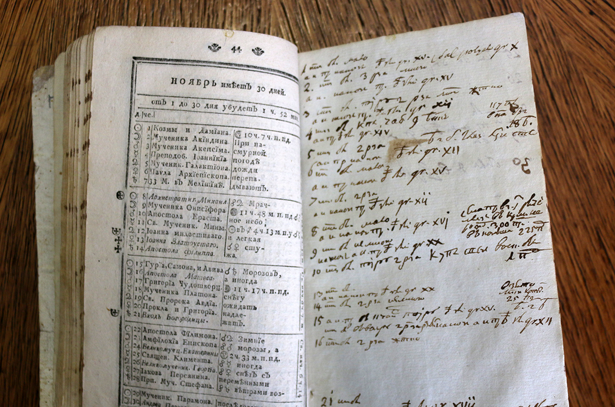 Вот «Месяцеслов на лето от рождества Христова 1786». В нём оставлено место для заметок, и владелец заполнил его своей рукой. А вот «Геометрия теоретическая и практическая», изданная в 1776 году, совершенно не нуждалась в дополнении, но у кого-то не было под рукой бумаги для черновика, и на форзаце появился незапланированный чертёж.