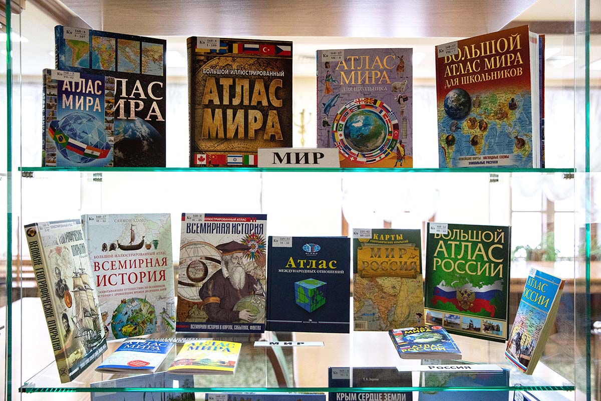 На выставке представлена большая и разнообразная коллекция современных отечественных и иностранных атласов и карт. Экспозиция включает геологические, экологические, этнографические, исторические и другие специальные атласы. Также широко представлены туристические атласы и карты, картография автодорожного транспорта, планы городов, путеводители, учебная картография, электронные картографические ресурсы, литература по картографии и географии, справочные и периодические издания.