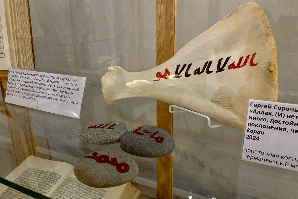 Мир Ближнего Востока неразрывно связан с арабской письменностью — и посетители смогут увидеть образцы иранской и арабской каллиграфии от художников Бахмана Панахи, Сергея Сорочьева и Ивана Семикова, уникальный для российского мусульманства стиль «шамаиль», наследие которого изучает Департамент культуры Духовного управления мусульман России.