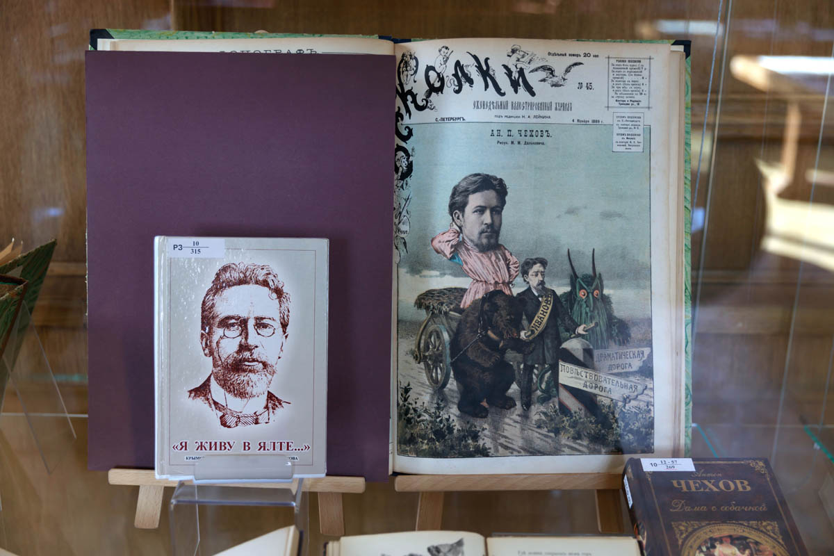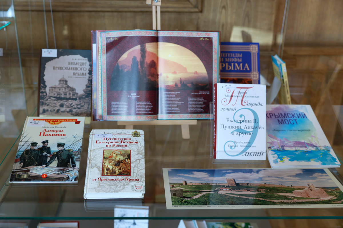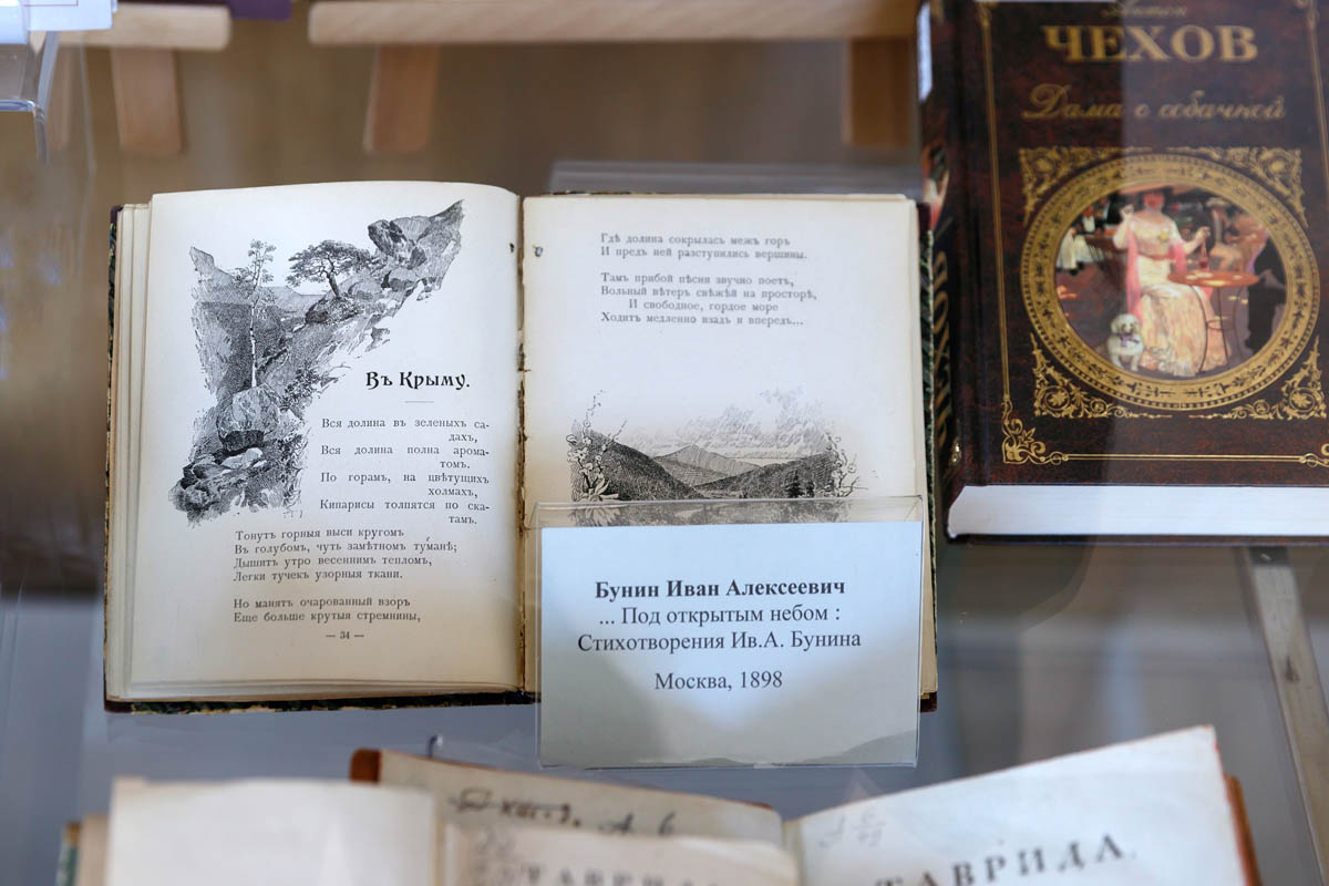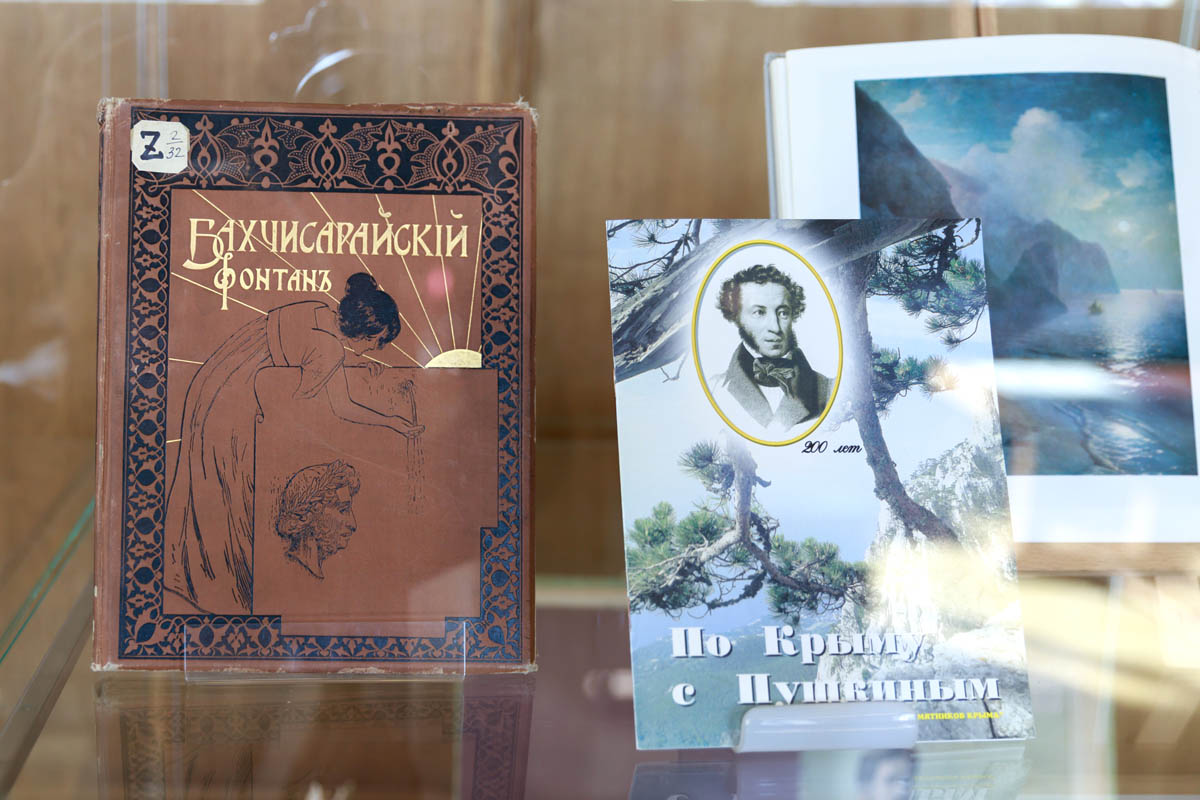 Александр Пушкин посетил Крым в 1820 году и позже написал поэму «Бахчисарайский фонтан». В витрине выставки представлена книга 1899 года издательства Иосифа Кнебеля, которую в стиле модерн проиллюстрировал художник Вардгес Суренянц. В экспозицию вошли книги Льва Толстого, Антона Чехова, Максимилиана Волошина, Александра Грина, сборники поэтов Серебряного века и других авторов.