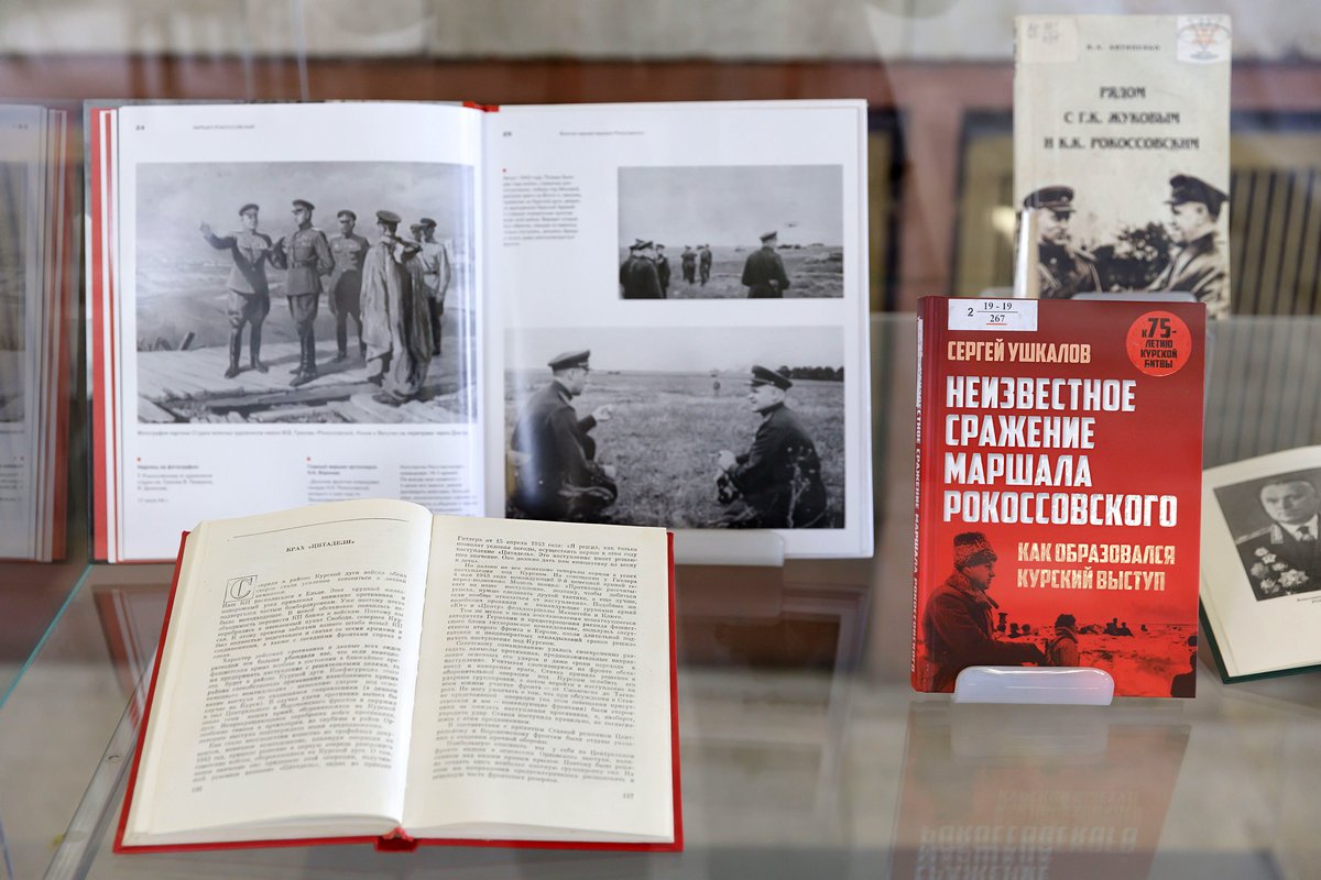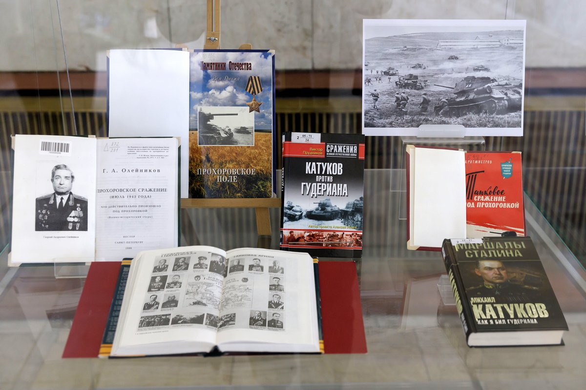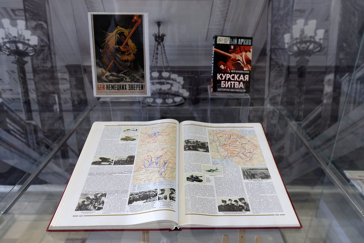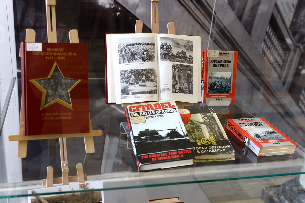 На выставке представлены документы, относящиеся ко времени Курской битвы; атласы и карты военных сражений; научные монографии; мемуарная литература — воспоминания, написанные не только командующими фронтами и армиями, но и участниками полевых боев; биографии выдающихся героев; обширный иллюстративный материал об одном из переломных событий Великой Отечественной войны.