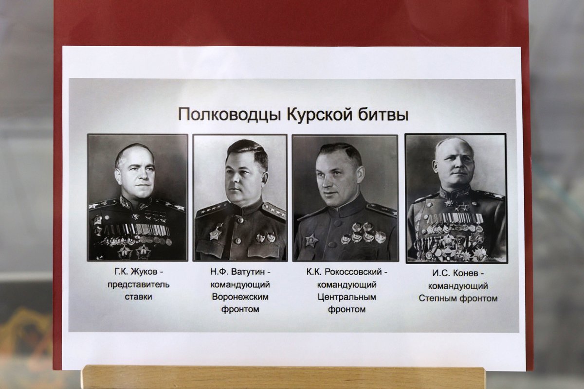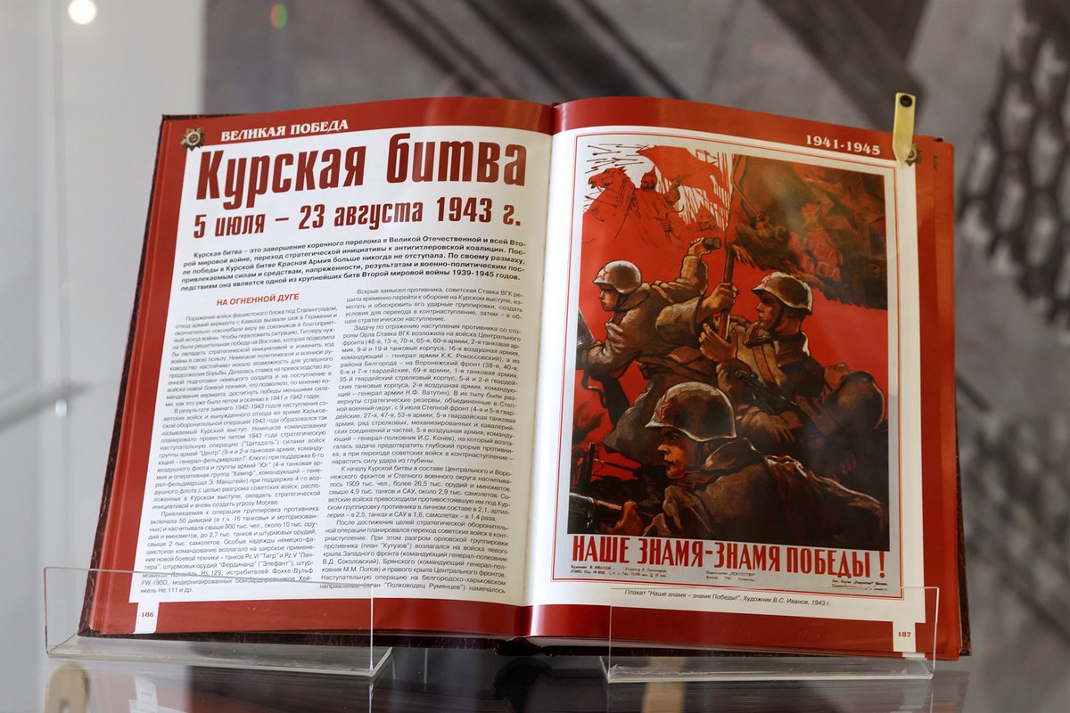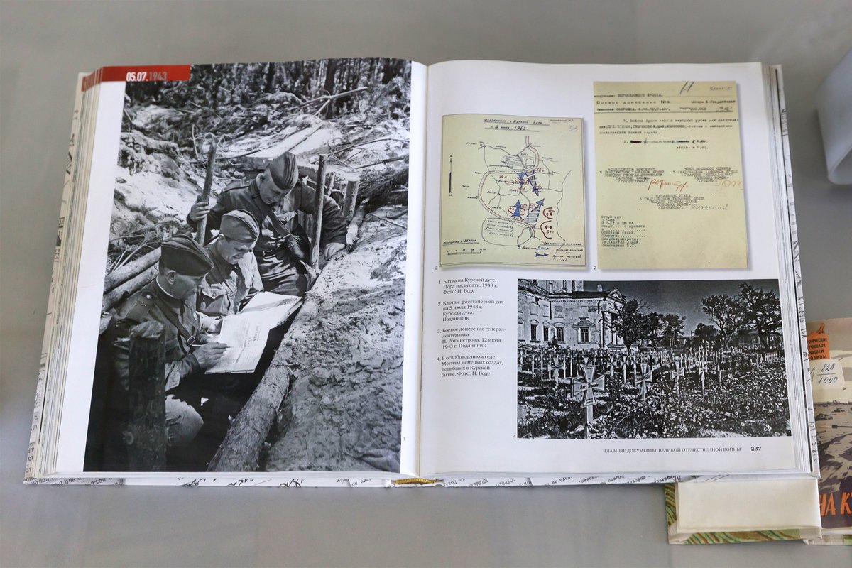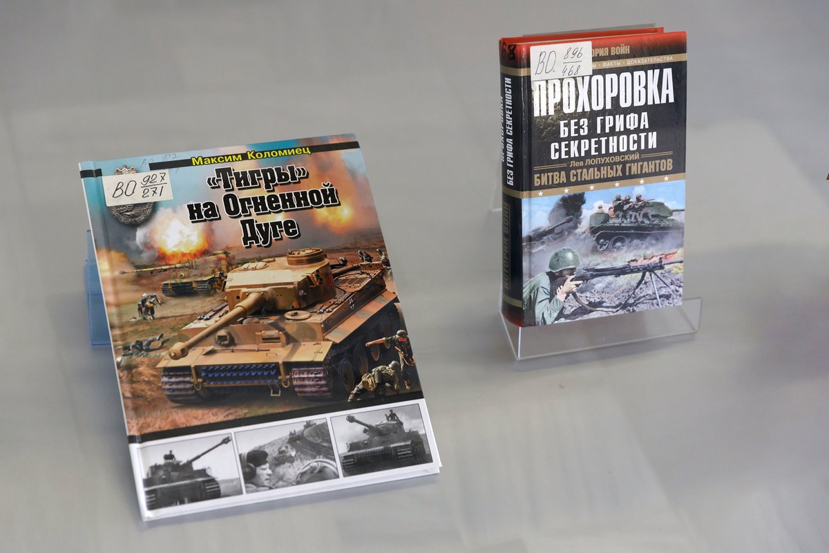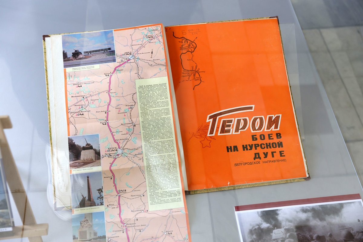 На выставке представлены документы, относящиеся ко времени Курской битвы; атласы и карты военных сражений; научные монографии; мемуарная литература — воспоминания, написанные не только командующими фронтами и армиями, но и участниками полевых боев; биографии выдающихся героев; обширный иллюстративный материал об одном из переломных событий Великой Отечественной войны.