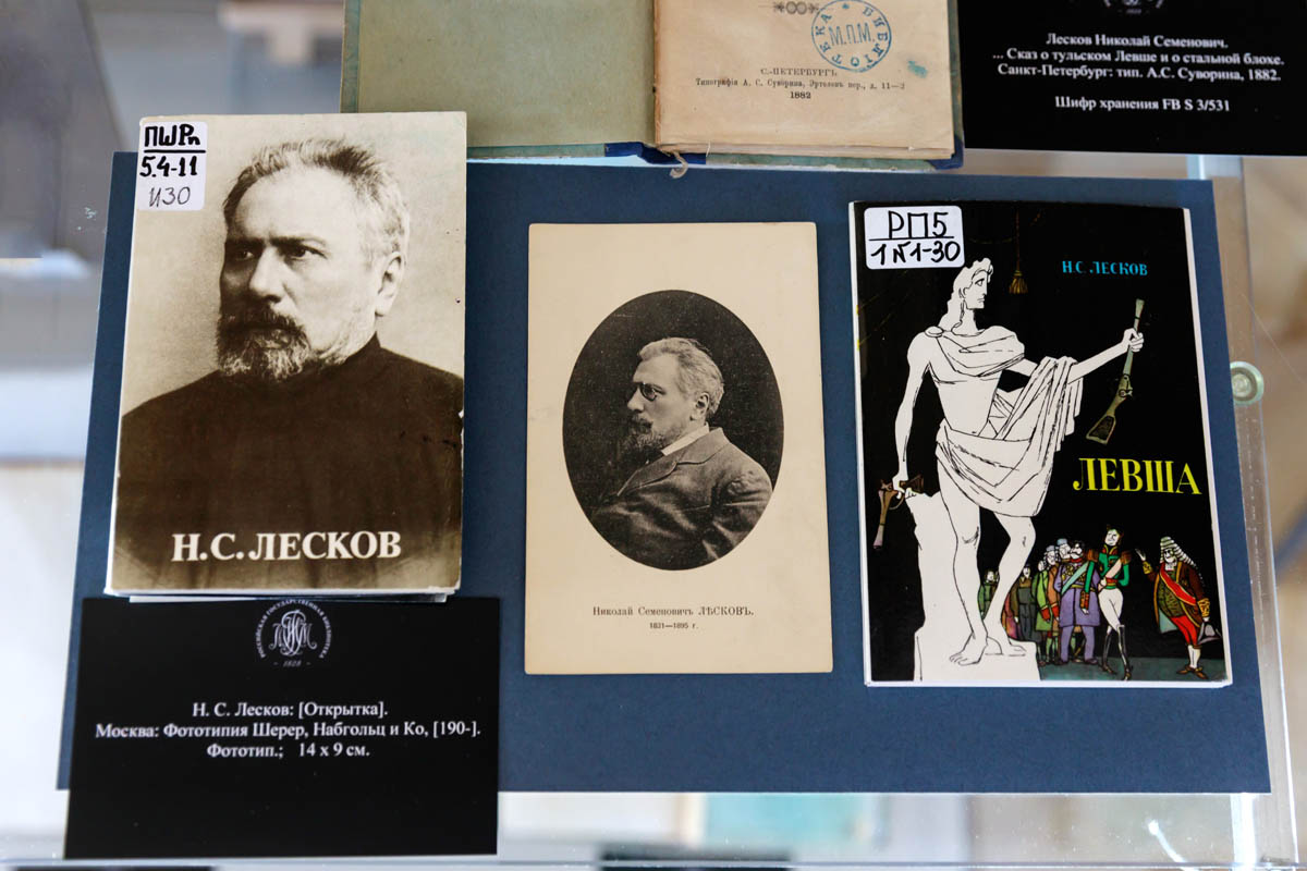 Экспозиция дополнена материалами из отдела изоизданий: репродукцией портрета Лескова работы художника Валентина Серова начала XX века, комплектом открыток «Малая родина Лескова» (Москва, 1989); комплектом открыток по произведениям писателя в иллюстрациях Ильи Глазунова (Москва, 1985); открытками по произведению «Левша» в иллюстрациях художников Кукрыниксов (Москва, 1979).
