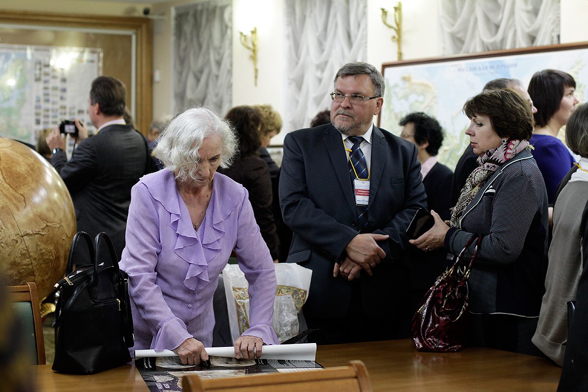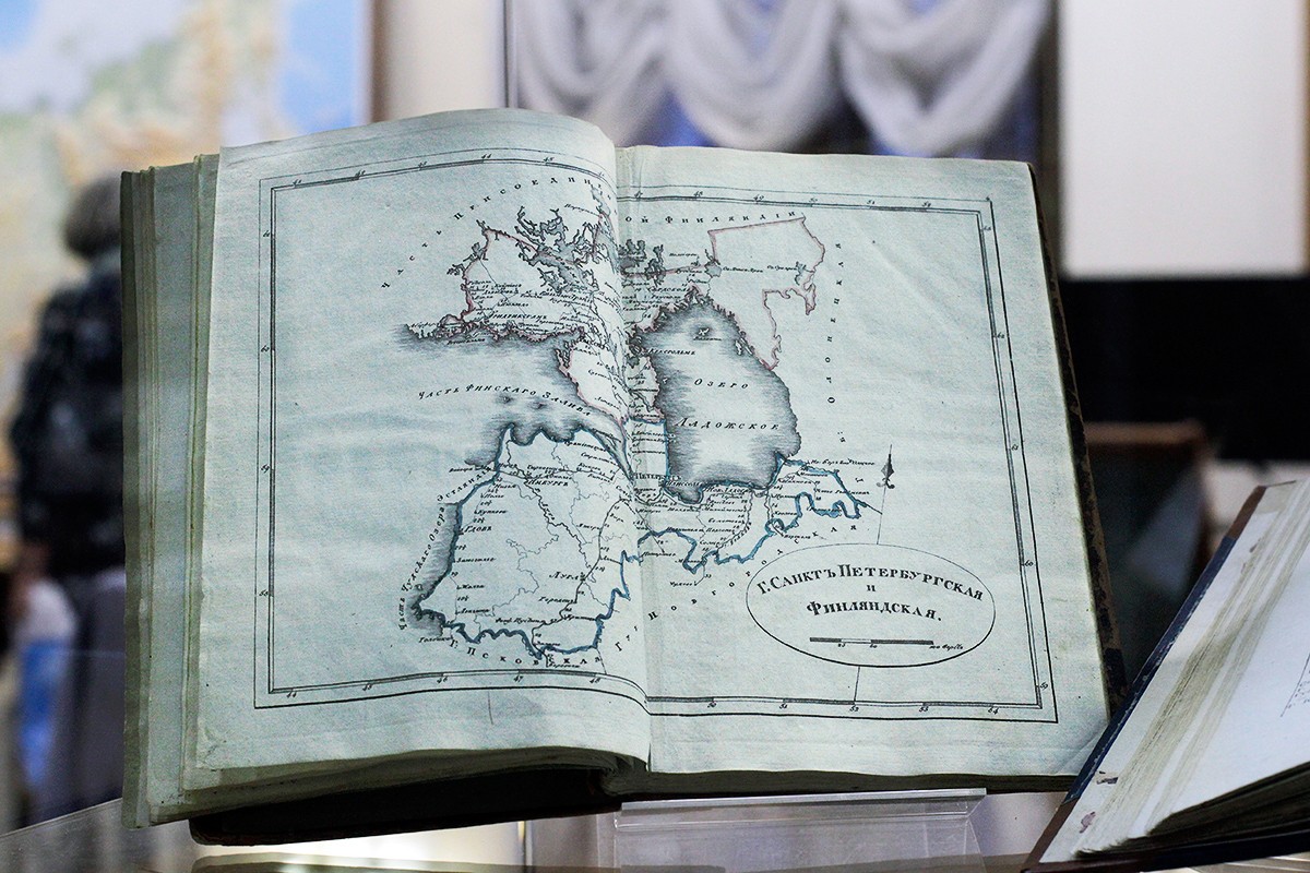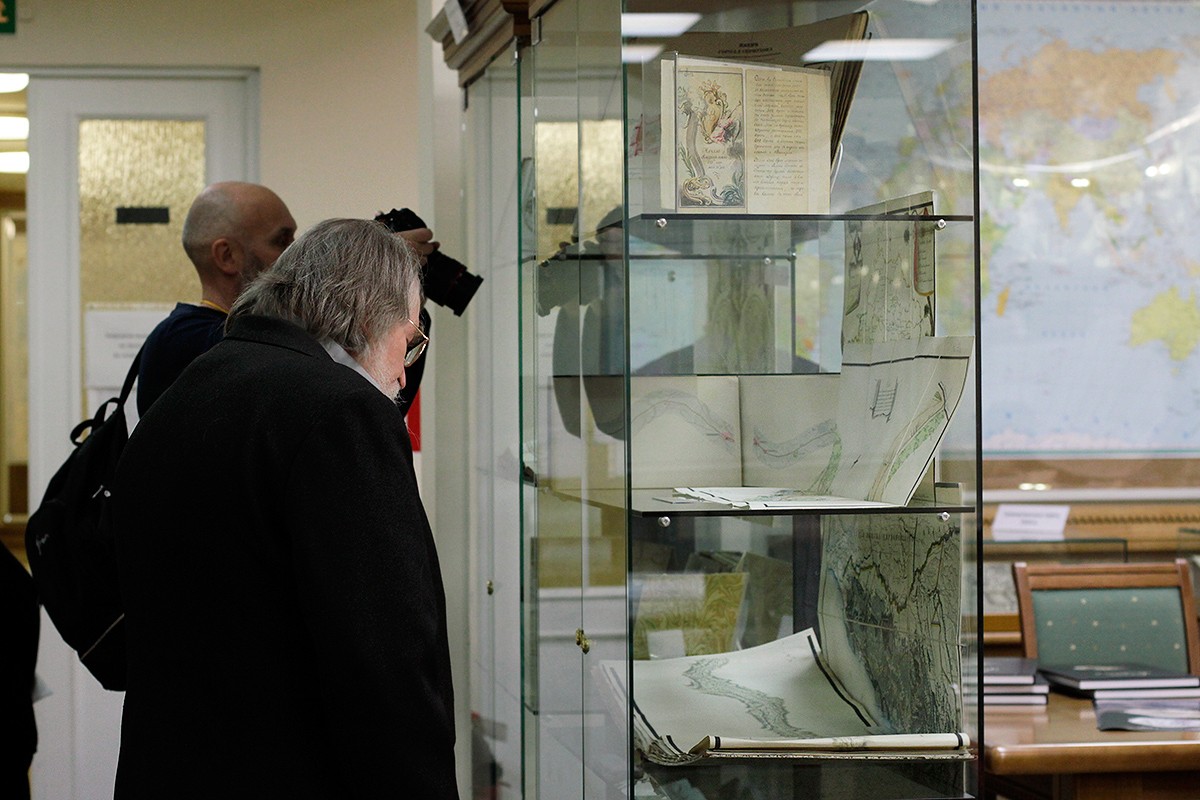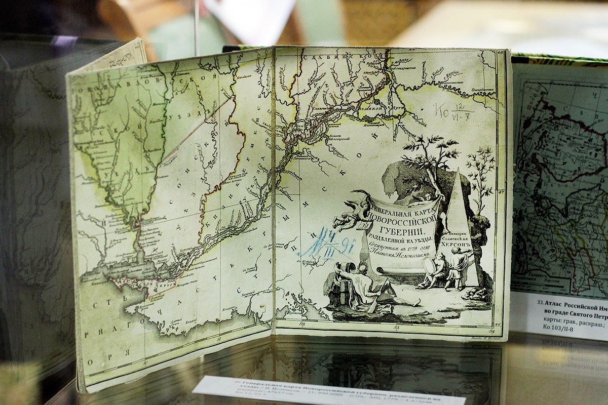 Подлинным украшением выставки являются две рельефные карты: карта Российской Федерации (в масштабе 1:3 500 000) и карта Крыма (1:250 000), созданные Федеральным научно-техническим центром геодезии, картографии и инфраструктуры пространственных данных и переданные в дар Российской государственной библиотеке, а также Гипсометрический глобус Меркурия, подготовленный Московским государственным университетом геодезии и картографии. Экспозиция шедевров русской картографии включает следующие разделы: гравированные карты XVIII века; гравированные атласы XVIII века; рукописные атласы и карты XVIII—XIX веков; образцы оформительского искусства атласов и карт XIX века. Экспозицию гравированных изданий открывают ксилографии — гравюры на деревянных досках, выполненные при монастырях. Это «Пещера преподобного отца нашего Антония Печерского» и «Пещера преподобного отца нашего Феодосия Печерского», перепечатанные в начале XVIII века в Киево-Печерской лавре с плана XVII века. Гравюры, выполненные на медных досках, также представлены наиболее ценными изданиями: « Генеральной картой о Российской империи, сколько возможно было исправно сочинённой трудом Ивана Кирилова, обер-секретаря Правительствующего сената » (1734) и « Атласом, сочинённым к пользе и употреблению юношества и всех читателей ведомостей и исторических книг » , созданным и напечатанным при Академии наук в Санкт-Петербурге в 1737 году.