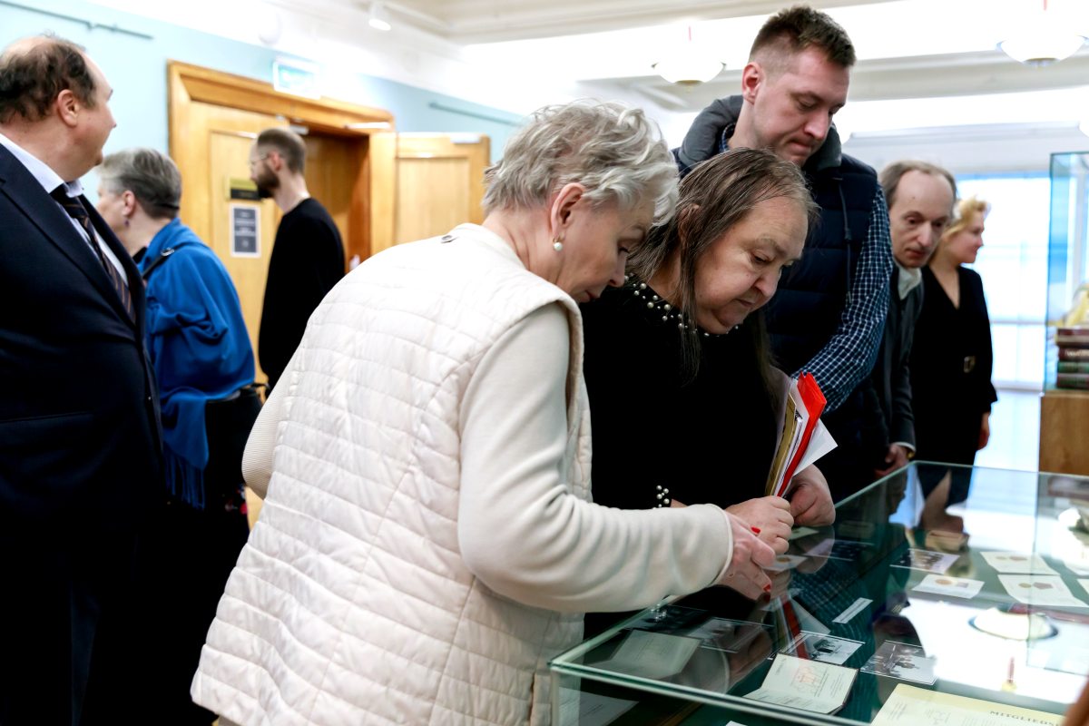 Среди таких, казалось бы, забавных и невеликих по размеру экспонатов, как значки, можно найти несколько с символикой Научно‑исследовательского института полиграфического машиностроения, куда Евгений Львович поступил работать в 1950 году после окончания института, или два значка с изображением Государственной библиотеки имени
