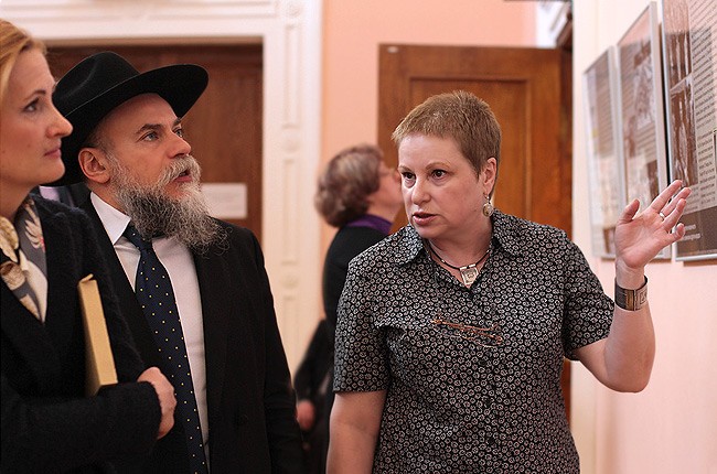 Председатель комитета Госдумы по безопасности и противодействию коррупции Ирина Яровая, президент Федерации еврейских общин России Александр Борода и заведующая отделом приоритетного обслуживания РГБ Инна Малахова на открытии выставки.