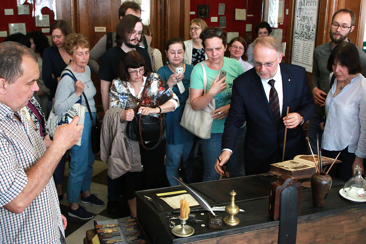 Сергей Иванович Нелюбов, офицер запаса, уполномоченный эксперт по культурным ценностям Министерства культуры Российской Федерации, председатель Калужского общества коллекционеров, создатель и директор Музея русского быта «Вотчина», привёз свои сокровища на выставку «Обиход писца», организованную Музеем книги и приуроченную ко Дню славянской письменности и культуры. Сергей Иванович встречал посетителей выставки, выступал перед участниками Книговедческих встреч и подробно рассказывал о предметах из своей коллекции — без его пояснений догадаться о назначении некоторых из них современному человеку практически невозможно.