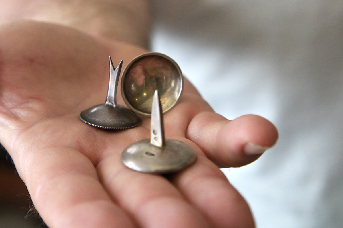 «Найти кованые ножницы было очень трудно: то попадались сломанные, то не подходили по возрасту к другим предметам — были изготовлены или раньше, или позже, то не резали, а для меня было важно, чтобы этим инструментом можно было пользоваться... Если у старинной чернильницы потерялась крышечка, подобрать её невозможно: каждая делалась точно под конкретную чернильницу... Лощильный „зуб“ нужен был для разглаживания кож, бумаги, сусального золота. Его делали из медвежьего или волчьего клыка. Клык для этой лощилки добыл мой друг-охотник».