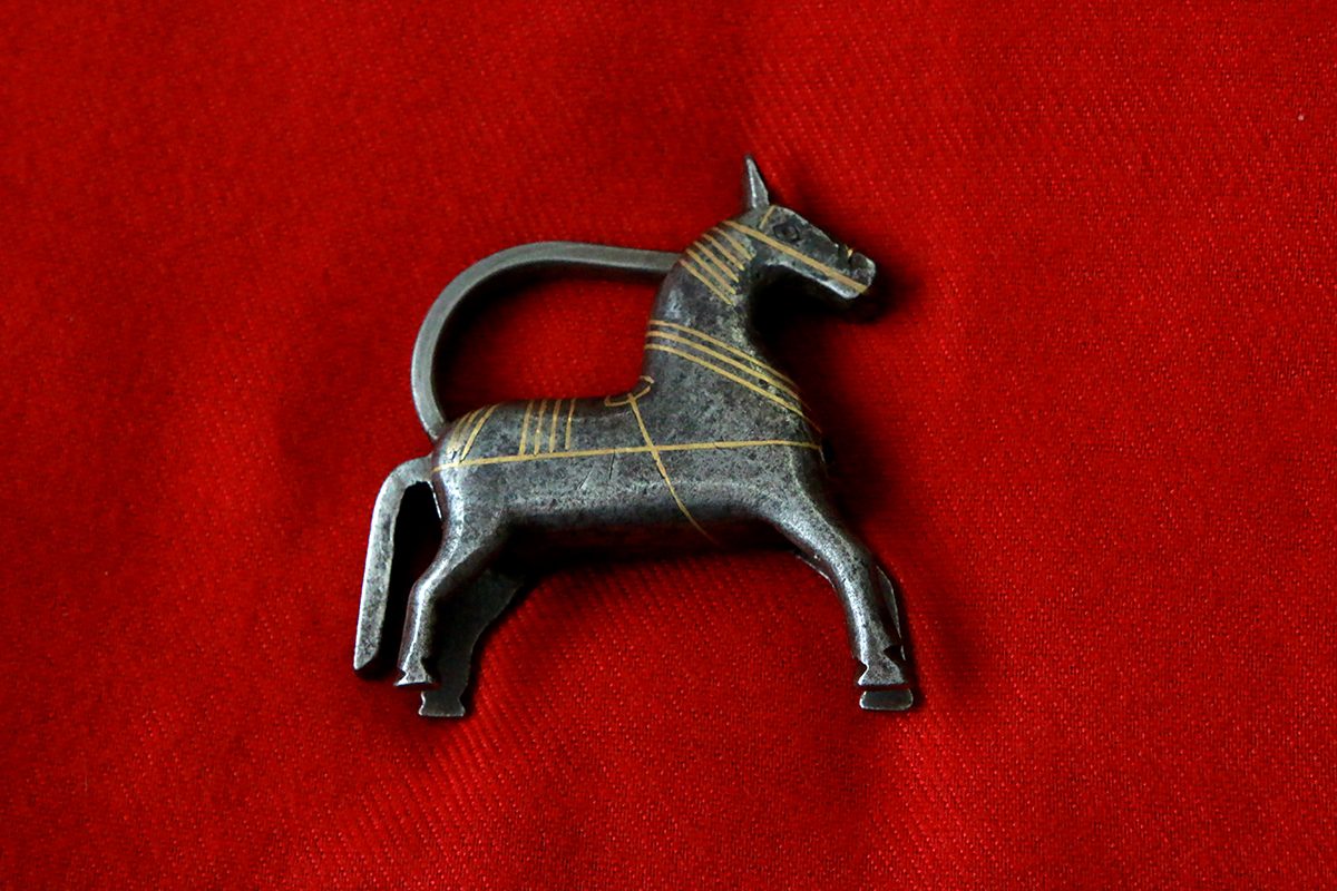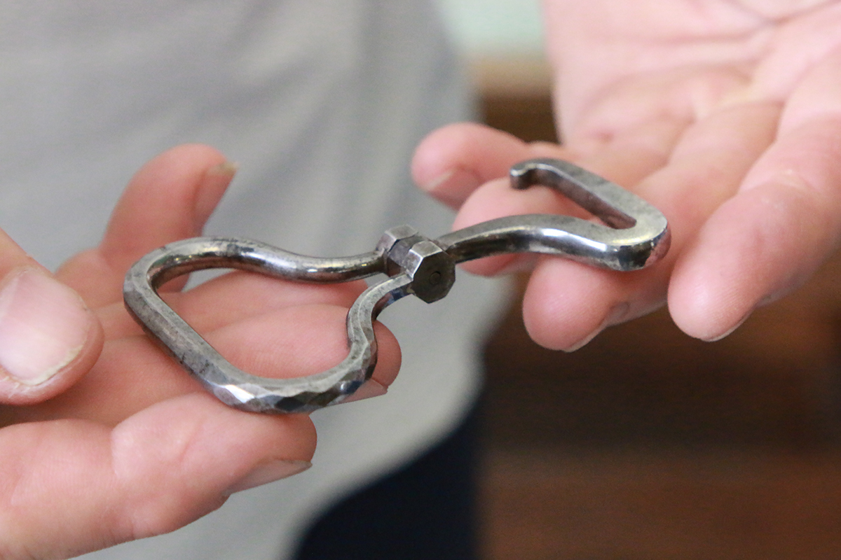 Очень интересный предмет — венчик для шампанского. Небольшой стерженёк, из которого появляется пучок тонких проволочек. Некоторые дамы не любят, когда в шампанском пузырьки. Ложкой их не разогнать, а венчиком — очень легко и быстро. Подарок для человека, у которого всё есть — ложечка для костного мозга. А сырные кнопки позволяют отрезать кусок сыра от большой головки, не коснувшись восковой корки. Замок-головоломка-лошадка запирает стол писца — его невозможно открыть, если не решить эту головоломку. А крючок для надевания сапог, сделанный в Туле, близок мне как подполковнику запаса.