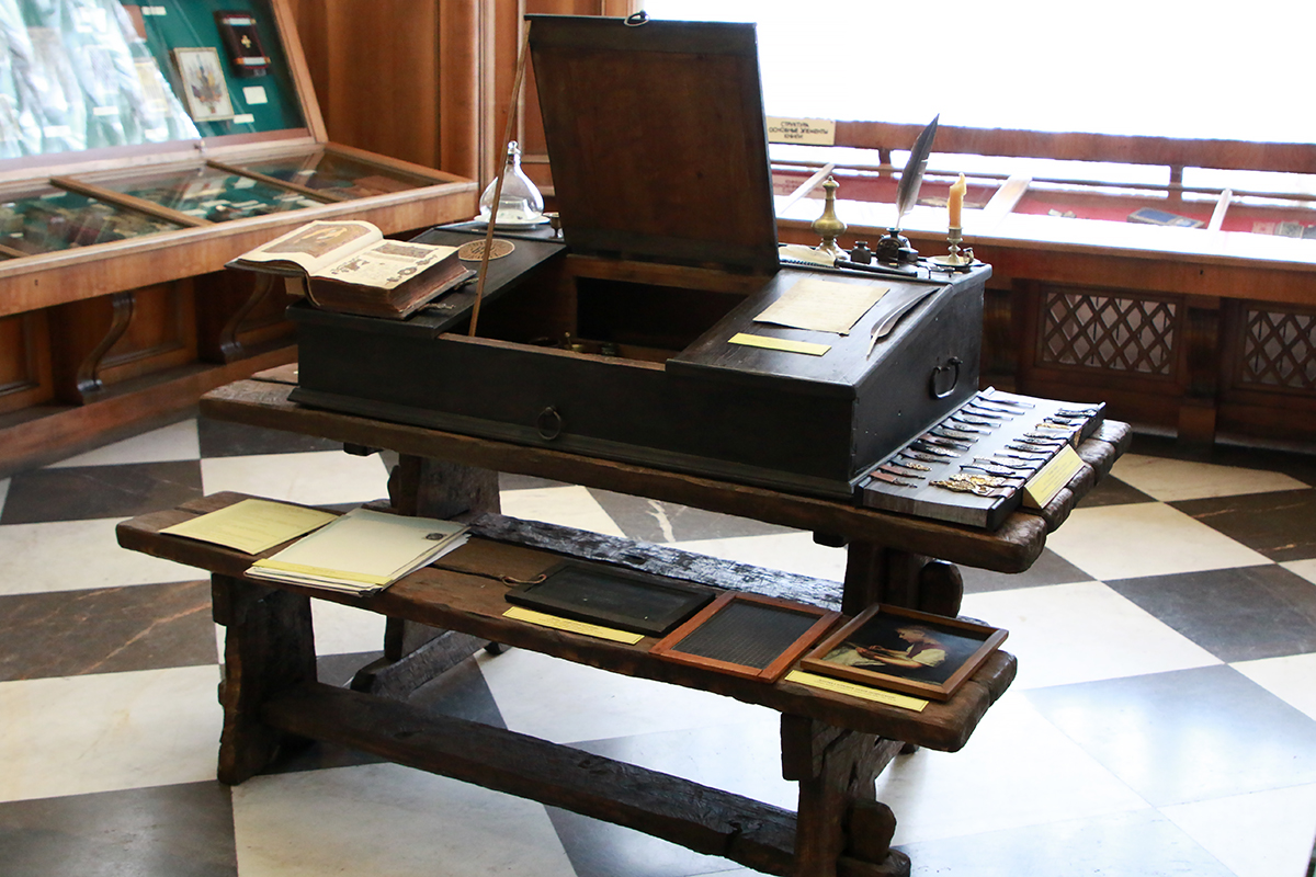Под крышкой и на столешнице расположились около 30 предметов — основные инструменты, принадлежности и утварь рабочего места. Здесь можно увидеть светец и мухоловку, аспидные и восковые таблички, писало и стилос, подвесную чернильницу из медного сплава и футляр для чернильных орешков, кружало (стальной циркуль) и колку (шило), карамсу — прибор для линования писчей бумаги, скобельник — металлическую лопаточку для зачистки ошибок в тексте, молоточек-кирочку для крепления книжных застёжек и несколько видов самих застёжек. Вот что сам Сергей Нелюбов говорит о некоторых предметах, вошедших в экспозицию: