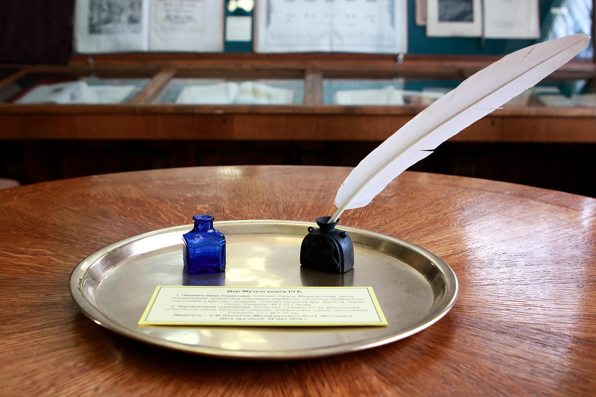 Музей книги Российской государственной библиотеки получил от Сергея Ивановича Нелюбова очень ценный подарок — две старинных чернильницы. Одна — синего кобальтового стекла конца XIX — начала XX века, а другая, подвесная, XVIII века, — из медного сплава, с изображением льва и единорога. Теперь они займут почётное место среди других сокровищ Музея книги.