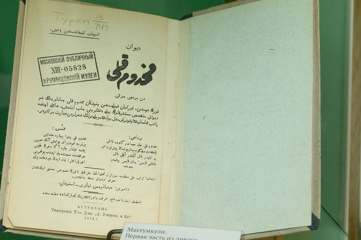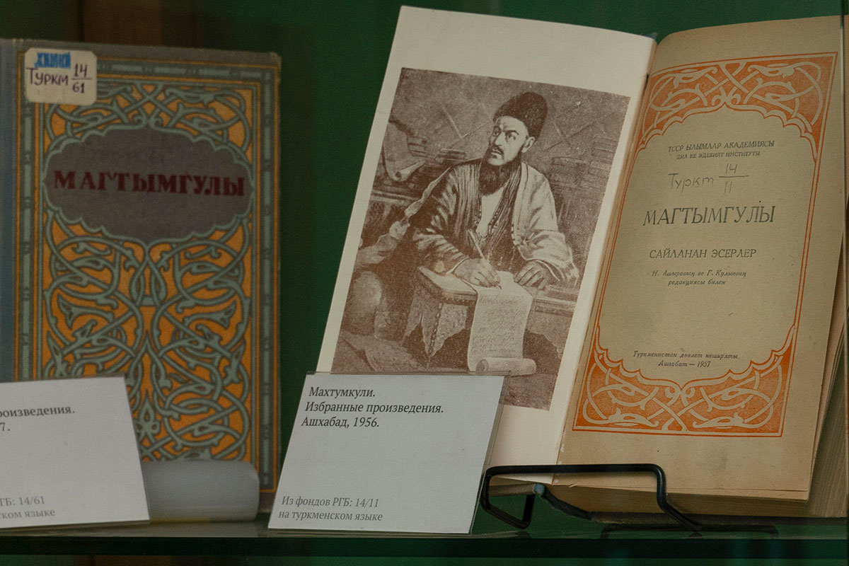 Экспозиция состоит из двух частей. Книжная экспозиция представлена изданиями Махтумкули на туркменском и русском языках. Особый интерес вызывают старопечатные книги: самый ранний из представленных на выставке сборник опубликован в Астрахани в 1912 году.