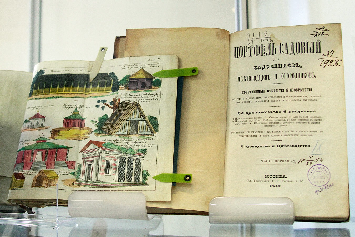 На витрине, посвящённой допетровским временам, вы увидите фундаментальный труд выдающегося историка и археолога Ивана Егоровича Забелина (1820—1908) «Домашний быт русских царей и цариц» . Петровская эпоха привела в Россию сады, устроенные на европейский манер. Шиповник сменяется розами, цветочные клумбы вытесняют грядки с овощами. Появляются парки, не имеющие никакого утилитарного значения — это только радующее глаз место для прогулок. В Европе парки делились на пейзажные и регулярные. Регулярный (французский) парк — имеющий геометрически правильную планировку, с прямыми аллеями, цветниками правильной формы, фигурно подстриженными деревьями и кустарниками. Образцы регулярного парка в России — Летний сад, усадьба «Кусково», Петергоф. Пейзажный (английский, иррегулярный) парк — тот, что следует за уже существующим ландшафтом, расставляя акценты, не переделывая то, что создала природа. Такие парки — Гатична, «Царицыно», «Кусково». Впрочем, нельзя сказать, что это чистые образцы традиционного паркового искусства. Парки в России самобытные, представляют, скорее, смешение обоих стилей с изрядной долей самобытности. Русское направление в садово-парковой культуре прочно связано с именем первого российского учёного-агронома, ботаника и лесовода Андрея Тимофеевича Болотова (1738—1833). Андрей Тимофеевич писал так: «Не было б нимало постыдно для нас то, когда бы были у нас сады не Англинские, не Французские, а наши собственные и изображенные самими нами и когда б мы называть их стали Российскими». Обязательно уделите внимание акварелям, представляющим работу Андрея Тимофеевича, — знаменитой усадьбе Бобринских в Богородицке.