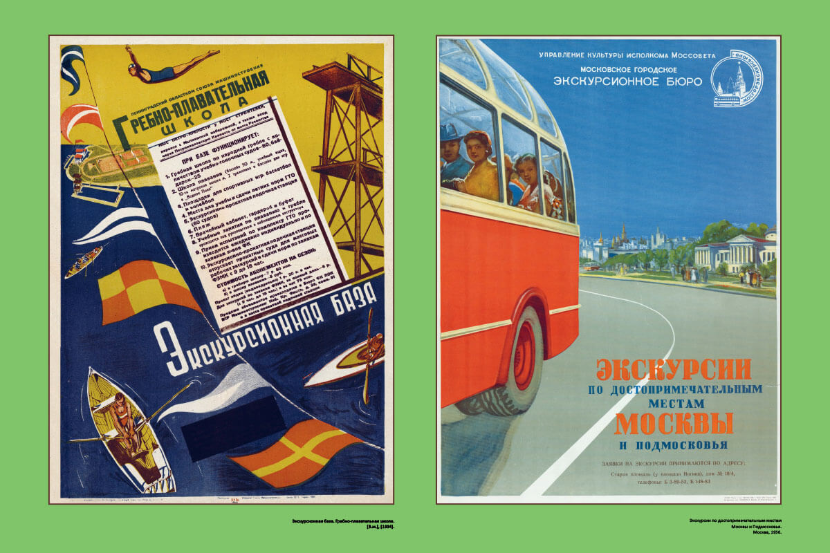 Развитие внутреннего туризма отчасти перекликалось с идеями активной счастливой жизни. Плакаты сохранили наивный пафос отпускного путешествия: «Пассажир, запомни надолго: от вагонов до светлых кают в теплоходах на море, на Волге — стол накрыт и везде тебя ждут!».
