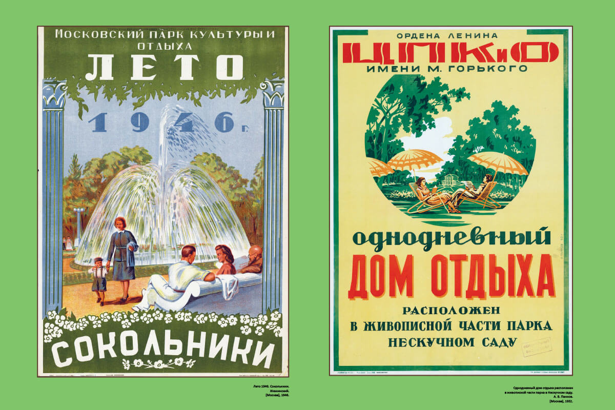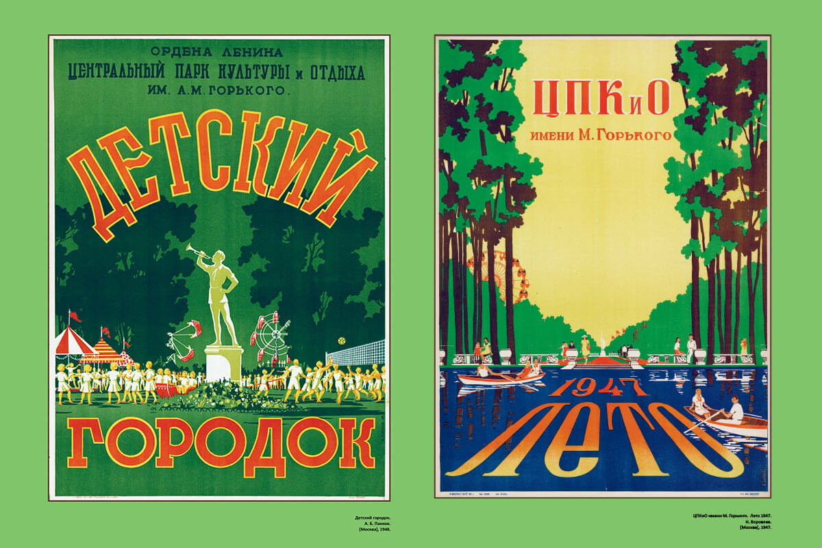 В Москве Центральный парк культуры и отдыха имени М. Горького (ЦПКиО) воспринимался как идеальная модель досугового «культурного комбината», по образцу которого создавались парки по всей стране. Помимо вполне традиционных зелёных насаждений — аллей для прогулок, газонов и клумб, в ЦПКиО действовали многочисленные аттракционы, кафе, спортивные и танцевальные площадки, читальни, театры и кино, а также ясли, аллея гамаков, обсерватория, детская железная дорога, и абсолютная новация на момент открытия — развлекательная парашютная вышка. Особое значение придавалось архитектурному облику парка, над планом и павильонами которого работали лучшие архитекторы.