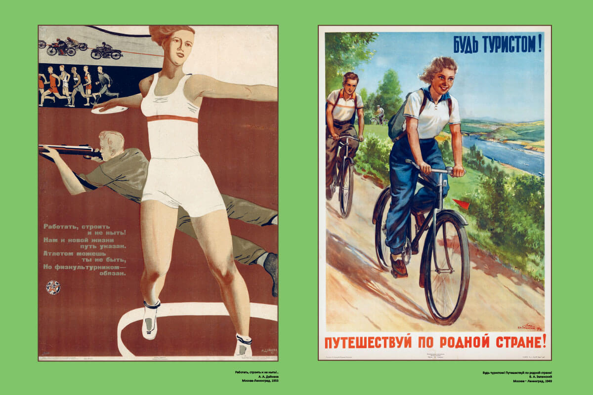 В плакате Александра Дейнеки «Работать, строить и не ныть!» наиболее чётко сформулирован основной принцип новой спортивной политики: «Спортсменом можешь ты не быть, но физкультурником обязан!». Плакаты, рекламирующие спортивные мероприятия и обучающие правилам и технике исполнения упражнений в разных видах спорта позволяют говорить о широкой информационной поддержке.