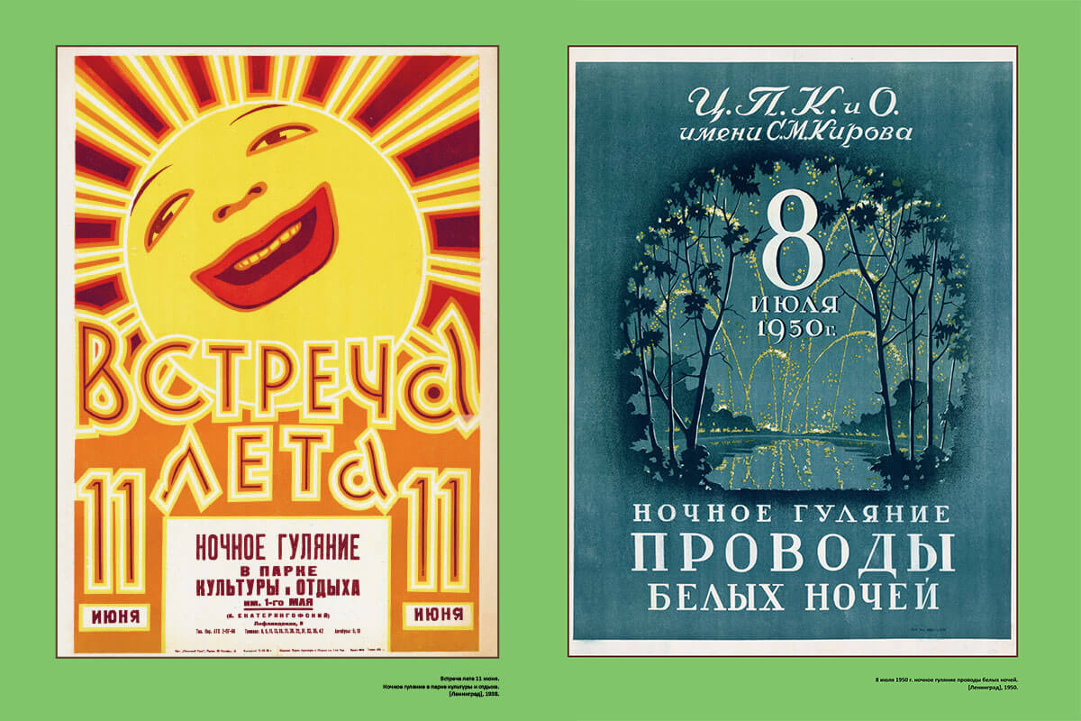 Особое значение отводилось культурно-массовым мероприятиям. В собрании РГБ сохранились плакаты, посвящённые как вполне нейтральным форматам «Открытия летнего сезона», так и радостно-бравурные «Встреча лета» и лирические с региональным оттенком — «Проводы белых ночей». Интересно, что в 30-е годы активно развивается такая разновидность празднования, как карнавал-маскарад, используемая в организации не только новогодних, но и первомайских и ноябрьских торжеств, но особенно популярных летом.