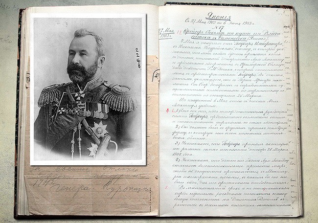 Рядом с документами Алексеева — неопубликованная часть записок главнокомандующего всеми сухопутными и морскими частями, действовавшими против Японии, Алексея Николаевича Куропаткина «Россия и Япония» . Этот дневник он вел до начала войны, в 1903 году, во время своей поездки на крейсере «Аскольд» в Японию: «Одною из задач ставилось безотлагательное принятие мер, чтобы не допустить проникновения в Маньчжурию иностранного влияния в каком бы то ни было виде, для чего признавалось необходимым в минимальный срок и не останавливаясь перед нужными расходами поставить нашу боевую готовность на Дальнем Востоке в равновесие с нашими политико-экономическими интересами». Из всех участников Русско-японской войны Куропаткин прожил самую долгую жизнь и даже стал библиотекарем. После революции в своем имении в селе Шемшурино Тверской области он открыл крестьянскую школу, где преподавал, а также заведовал волостной библиотекой. Владимир Набоков упоминает о встрече с Алексеем Николаевичем в своем автобиографическом романе «Другие берега»: «Как-то... меня повели из детской вниз, в отцовский кабинет, показаться генералу Куропаткину, с которым отец был в коротких отношениях. Желая позабавить меня, коренастый гость высыпал рядом с собой на оттоманку десяток спичек и сложил их в горизонтальную черту, приговаривая: "Вот это — море — в тихую — погоду". Затем он быстро сдвинул углом каждую чету спичек, так чтобы горизонт превратился в ломаную линию, и сказал: "А вот это — море в бурю"».