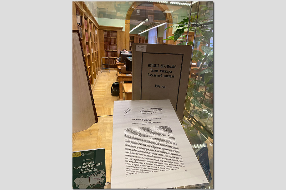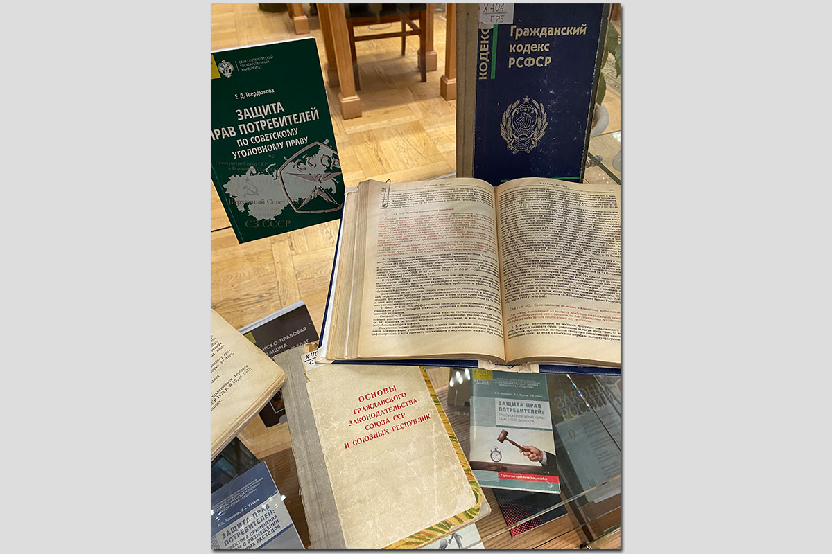 В настоящее время главным государственным органом по защите прав потребителей является Федеральная служба по надзору в сфере защиты прав потребителей и благополучия человека (Роспотребнадзор). На выставке представлены исторические правовые акты и действующее российское законодательство в области защиты прав потребителей, монографии и учебники.