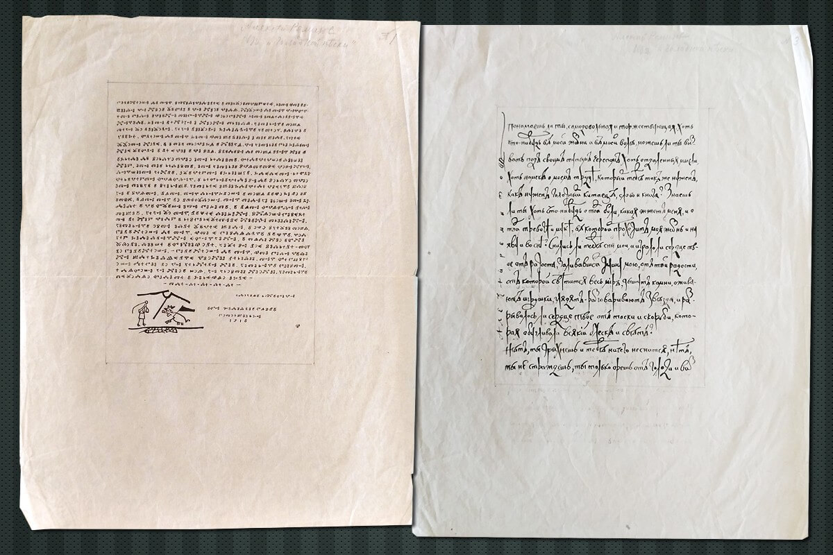 Алексей Михайлович Ремизов знал и кириллицу, и глаголицу. В экспозиции — автограф Ремизова, сделанный на глаголице. Глаголицей он активно пользовался при оформлении своих рукописей.