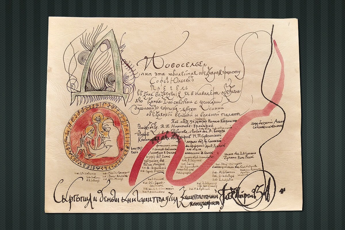 Алексей Ремизов, прекрасно рисовавший, сам оформлял грамоты. Каждому члену ордена присваивался титул и новое имя. Первые были вручены в 1908 году, последняя датирована 1957 годом, годом смерти Ремизова. На выставке в Румянцевском читальном зале вы можете увидеть сразу две такие грамоты — а всего их было выдано 345 за почти полувековую историю существования ОБЕЗВЕЛВОЛПАЛа. Членами Обезьяньей великой и вольной палаты были Максим Горький, Михаил Пришвин, Михаил Кузмин, Николай Гумилев, Иван Бунин, Анна Ахматова, Александр Блок, Андрей Белый, Василий Розанов, Юрий Анненков, Лев Бакст, Борис Пильняк и другие. Александр Блок, например, носил звание кавалера обезьяньего знака I степени с заяшным глазом, Анна Ахматова — кавалер обезьяньего знака I степени с беличьими коготками, Лев Бакст — обезьяний старейшина, известный пушкинист Павел Щёголев — старейший князь обезьяний, кавалер знака I степени с хвостом и лапой.
