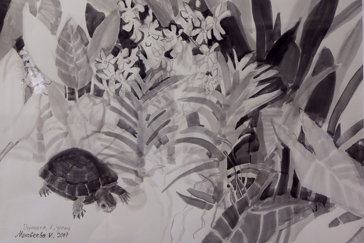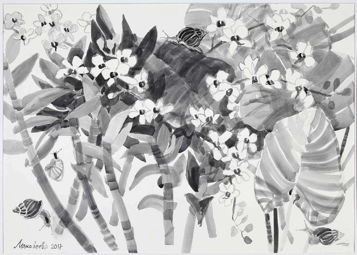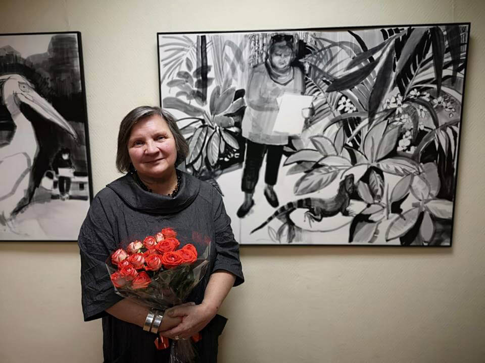 Это не первая моя выставка в ваших замечательных залах. У меня наработана большая коллекция печатной графики, я занималась «сухой иглой» и меццо-тинто. Но меня пригласили в проект, в ходе которого я посетила Таиланд, Сингапур, Бруней, Камбоджу. Это была подготовка к саммиту АСЕАН, который проходил в Сочи. Русские художники проехали эти страны. Путешествия произвели на меня неизгладимое впечатление. Открылся другой мир, очень богатый впечатлениями. Задача была максимально работать на пленэре, но так заканчивать работу, чтобы в конце поездки её можно было уже показывать. В этих поездках у меня собралось 50 больших листов. Технику использовала самую простую. Я поняла, что надо в Таиланд брать монохромную гуашь. Там такое яркое солнце, что практически цвета не видно. Чтобы отличаться от живописцев, стала работать в чёрно-белом варианте гризайли, то есть выбрала малую цветность. Я поняла, что это было правильное решение. Именно такая графика хорошо «выстрелила». Моя поездка в Индокитай показала, насколько растения, животные, птицы, насекомые, цветы, деревья, люди, — как это всё перемешивается и объединяется в некое пространство.