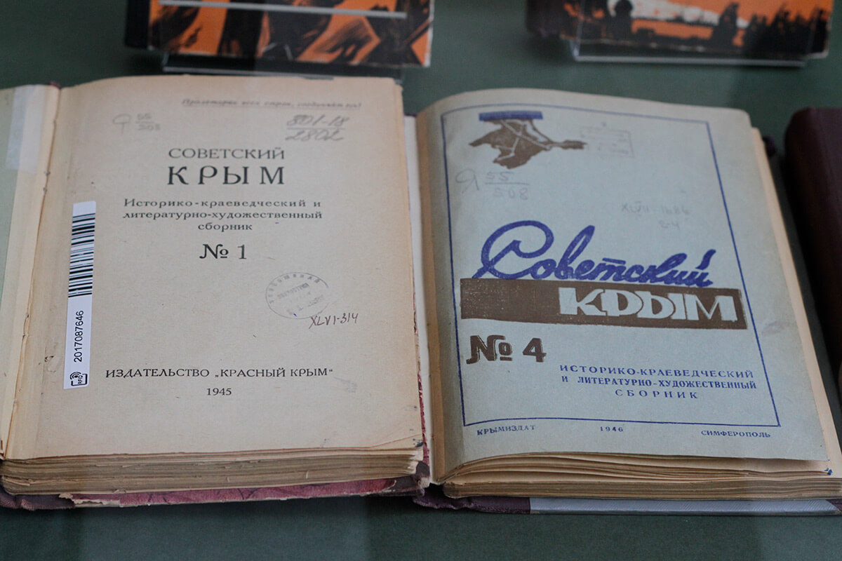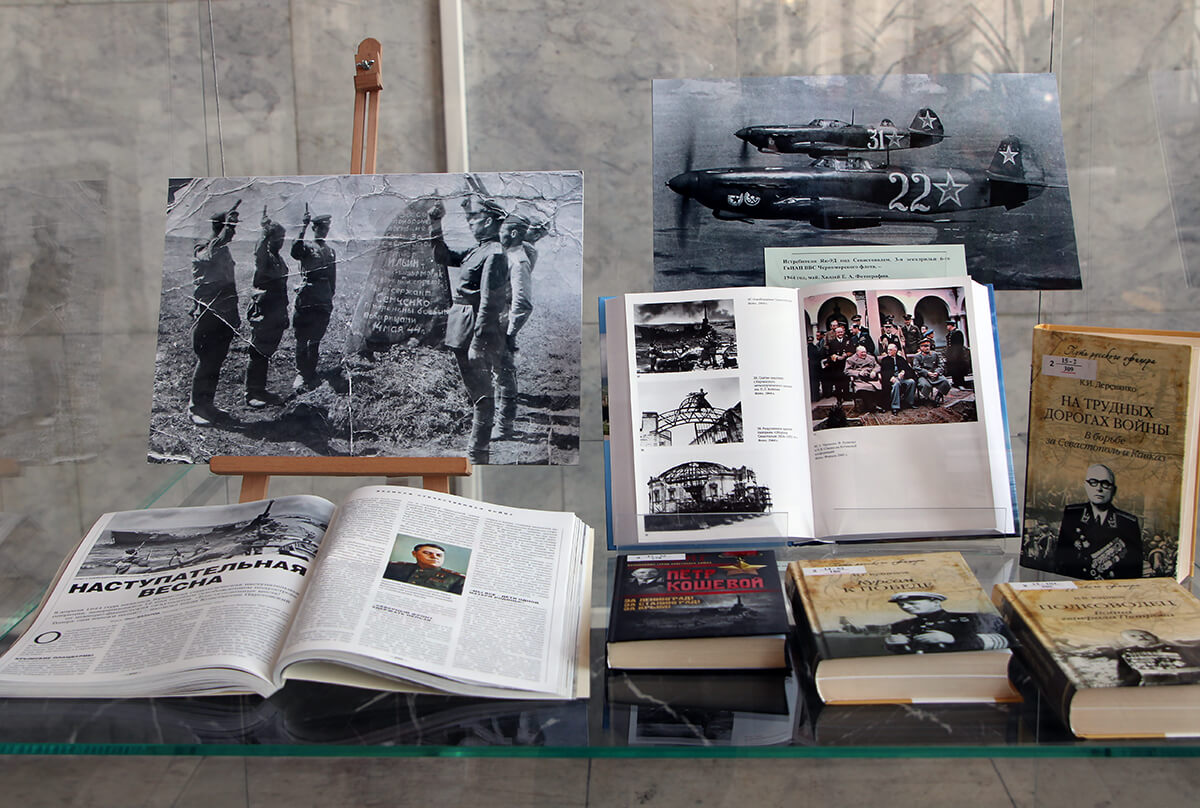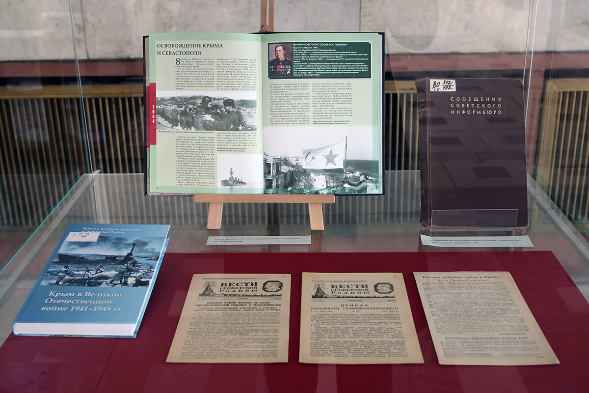 На юбилейной выставке представлены документы военного времени: оперативные сводки Советского Информбюро 1944 года; «Вести с Советской Родины» — информационные листки, издаваемые Главным Политуправлением Красной Армии во время военных действий для массового распространения; директивные документы Генерального штаба 1944 года из серии «Русский архив». В экспозицию вошли опубликованные в наши дни труды энциклопедического характера. Особый интерес представляют мемуары Александра Михайловича Василевского, Андрея Ивановича Ерёменко, Николая Герасимовича Кузнецова — военачальников, проводивших Крымскую операцию, — и издания военных историков о Фёдоре Ивановиче Толбухине, Якове Григорьевиче Крейзере, Иване Ефимовиче Петрове и других.