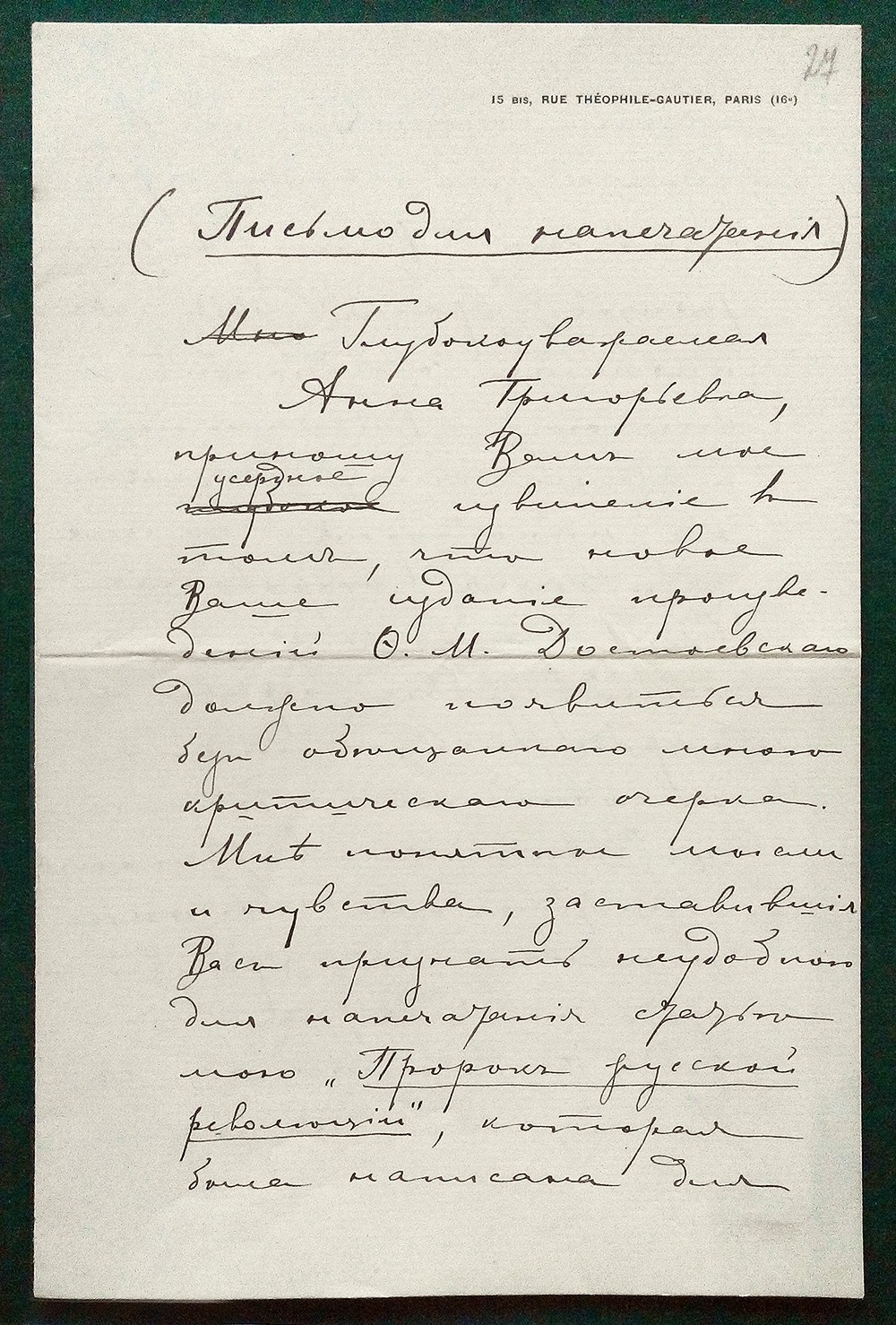 Однако Достоевский стал настоящим кумиром Мережковского. На выставке вы увидите переписку Дмитрия Сергеевича с вдовой Фёдора Михайловича Анной Григорьевной Достоевской. Анна Григорьевна просила Мережковского написать вступительную статью к юбилейному изданию собрания сочинений Достоевского. Статья «Пророк русской революции» была написана — и отвергнута Анной Григорьевной. Остановитесь у витрины прочтите это письмо, датированное 15 сентября 1906 года: «...я тогда же согласился с Вами, что, может быть, подобной статье не место в подобном классическом издании. Но ни изменить этот взгляд, ни даже высказать его в более умеренной форме я не в силах...».
