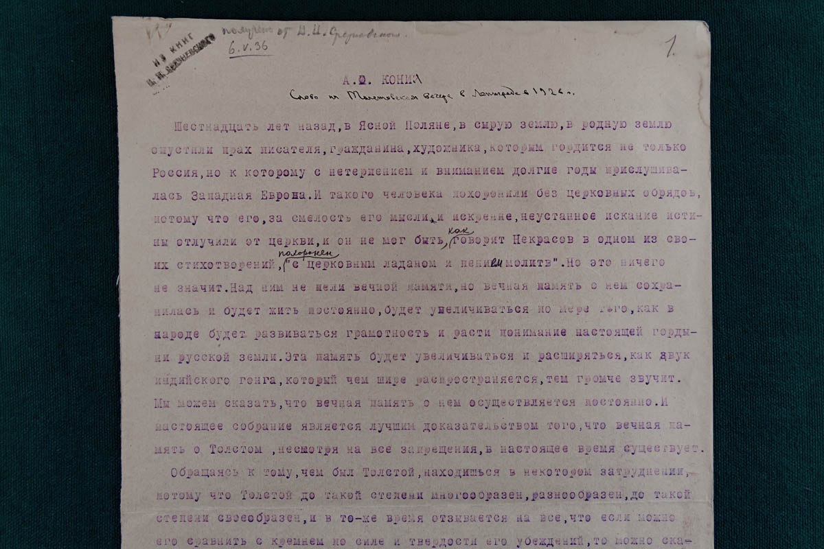 • Воспоминания Кони о Л. Н. Толстом. Слова на толстовском вечере в Ленинграде в 1926 году