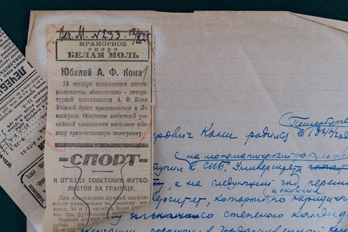 • Газетная вырезка с извещением о праздновании 60-летнего юбилея: Лобанов В. М. «Об Анатолии Фёдоровиче Кони — биографическая справка»