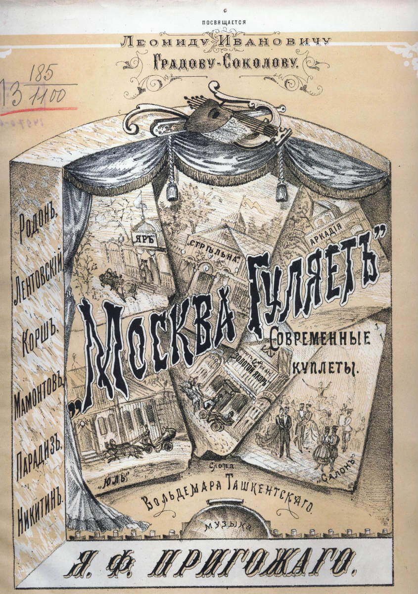 Пригожий, Яков Федорович. Москва гуляет : современные куплеты : для голоса с сопровождением фортепиано / слова В. Ташкентского. Москва, 1886.