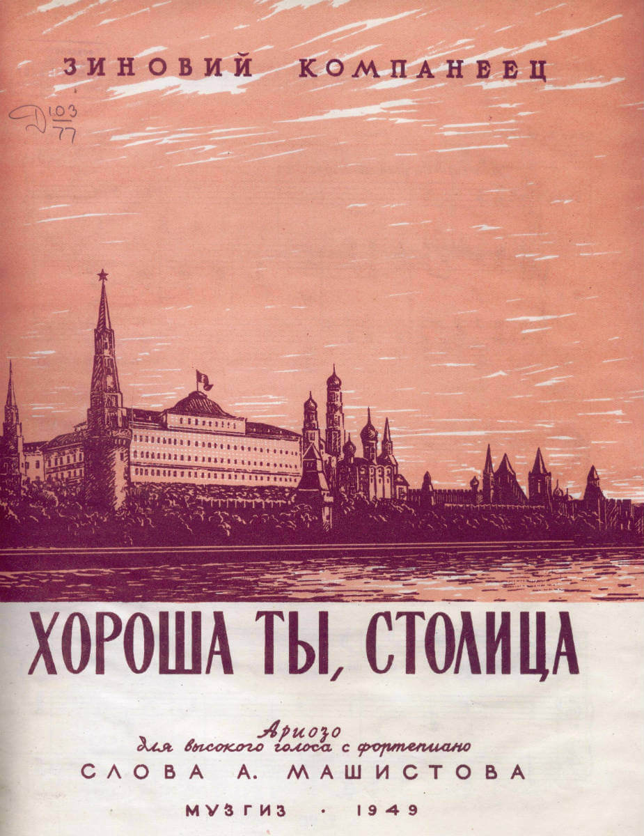 Компанеец, Зиновий Львович. Хороша ты, столица : ариозо для высокого голоса с сопровождением фортепиано / слова А. Машистова. Москва, 1949.