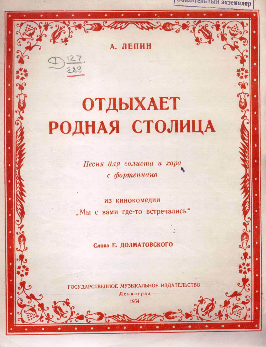 Лепин, Анатолий Яковлевич. Отдыхает родная столица : песня из комедии «Мы с вами где-то встречались» : для солиста и хора с фортепиано / слова Е. Долматовского. Ленинград, 1954.