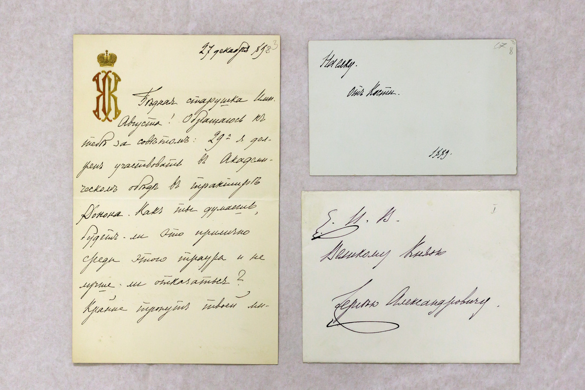 • Письмо великого князя Константина Константиновича Романова 27 декабря 1889 года и приглашение на ёлку, адресованные великому князю Сергею Александровичу Романову