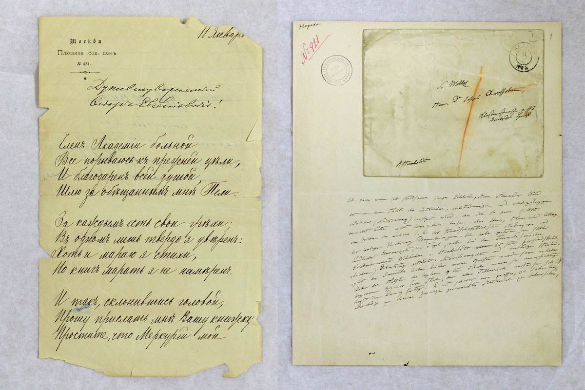 • Слева: письмо Афанасия Афанасьевича Фета к Фёдору Евгеньевичу Коршу в стихах («Член Академии больной...»). 11 января 1887 года. Автограф и рукой секретаря