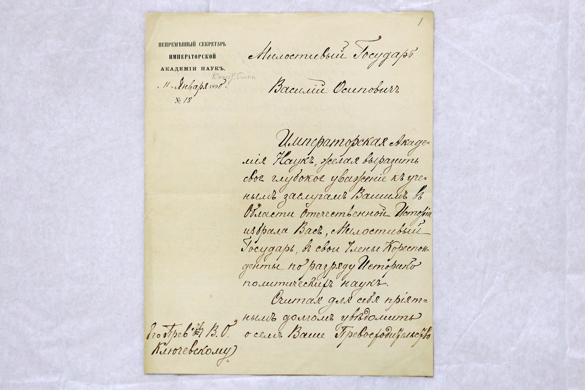 • Письмо-отношение Императорской академии наук к Василию Осиповичу Ключевскому с сообщением об избрании его в члены-корреспонденты Академии. 11 января 1890 года