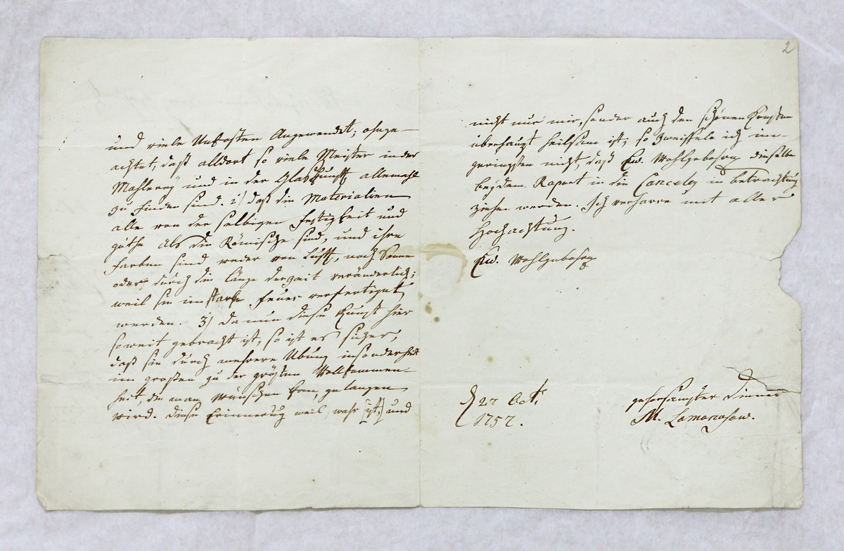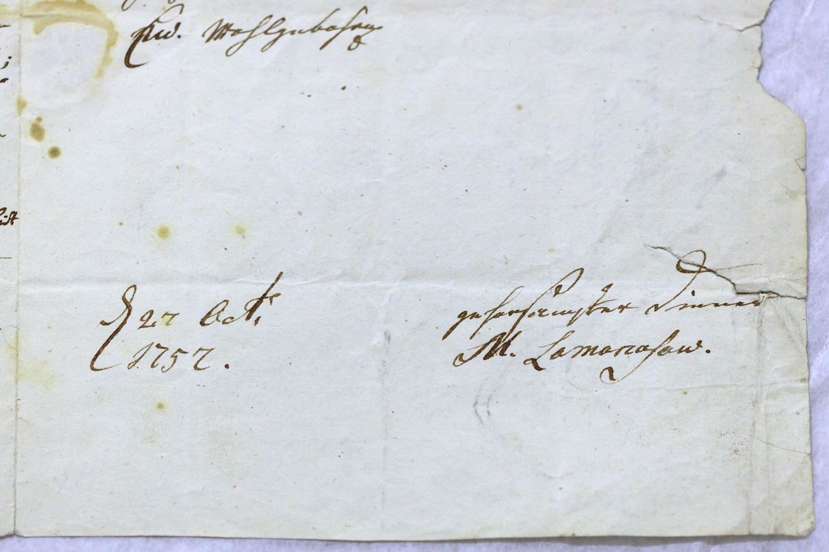 • Письмо Михаила Васильевича Ломоносова к академику Якову Яковлевичу Штелину. 27 октября 1757 года. На немецком языке