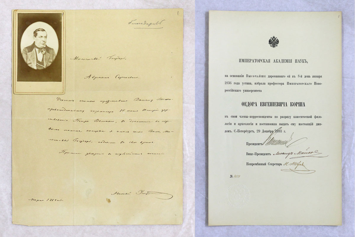 Справа: выданный Фёдору Евгеньевичу Коршу диплом на звание члена-корреспондента Императорской академии наук по разряду классической филологии и археологии. 29 декабря 1893 года