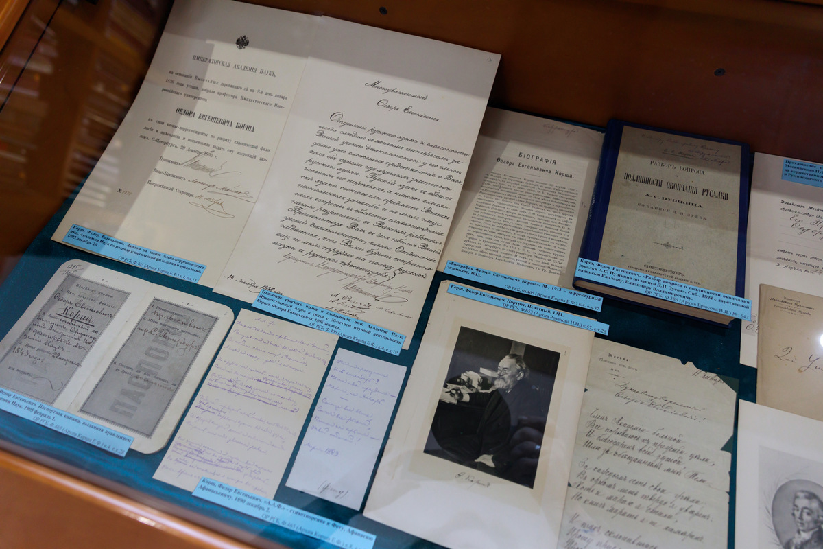 Персональный раздел выставки посвящён великому князю Константину Константиновичу — президенту Академии, поэту, переводчику, драматургу, при котором был учреждено звание почётного академика по разряду изящной словесности при Отделении русского языка и словесности. Благодаря великому князю в почётные академики были избраны Антон Павлович Чехов (1900), Александр Васильевич Сухово-Кобылин (1902), Иван Алексеевич Бунин (1909). В одном из разделов выставки находятся документы академика Петербургской академии наук, филолога, слависта, поэта-переводчика Фёдора Евгеньевича Корша, адресата лирики Фета, его известного стихотворения «Член Академии больной…».