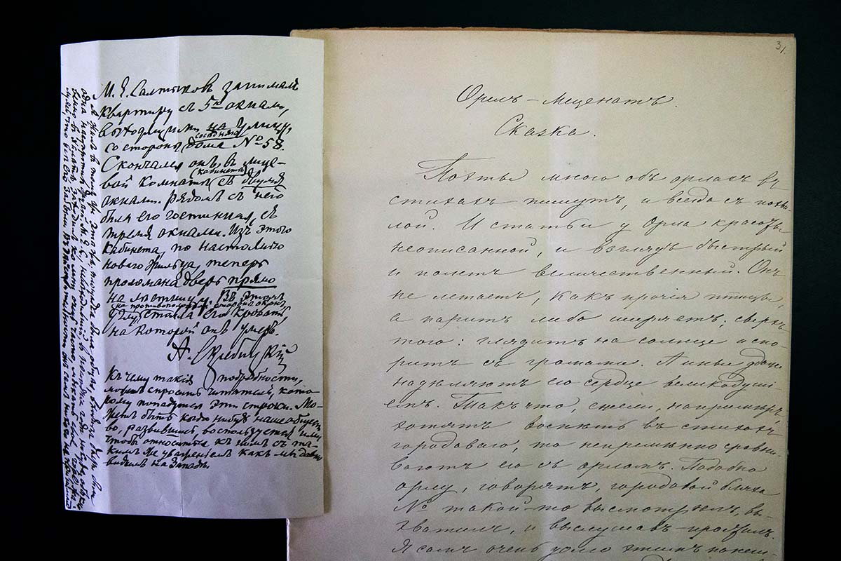 В первом разделе выставки представлены также черновые автографы творческих рукописей Салтыкова-Щедрина «Мнения знатных иностранцев о помпадурах», отрывок статьи-рецензии «О русской правде и польской кривде», отрывок статьи «Завещание моим детям», список сказки «Орёл-меценат» с подлинника рукой Марии Семёновны Скребицкой, хозяйки дома в Петербурге, где жил писатель на протяжении четырнадцати лет.