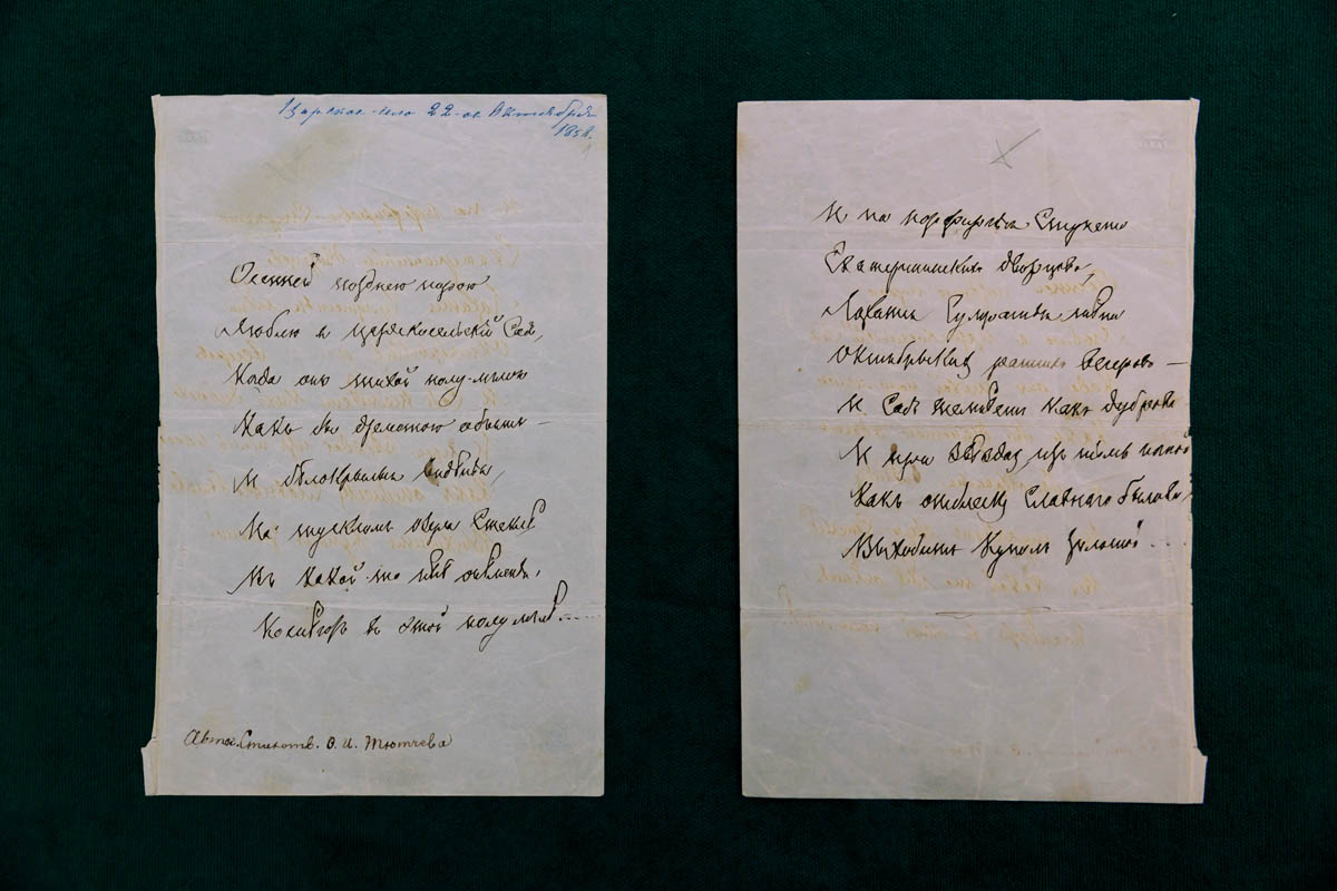 Эпистолярное наследие Тютчева — это прежде всего его письма Эрнестине Фёдоровне с 1840 по 1872 год. Часть из них будет показана на выставке. В письмах присутствуют стихотворения «Неман», «Лето 1854 г.», «Гуманный внук воинственного деда» («Его светлости князю Александру Аркадьевичу Суворову») и другие. Будут представлены письма Тютчева историку Михаилу Петровичу Погодину, князю Петру Андреевичу Вяземскому, князю Владимиру Петровичу Мещерскому, Дарье Ивановне Сушковой (урожденной Тютчевой).