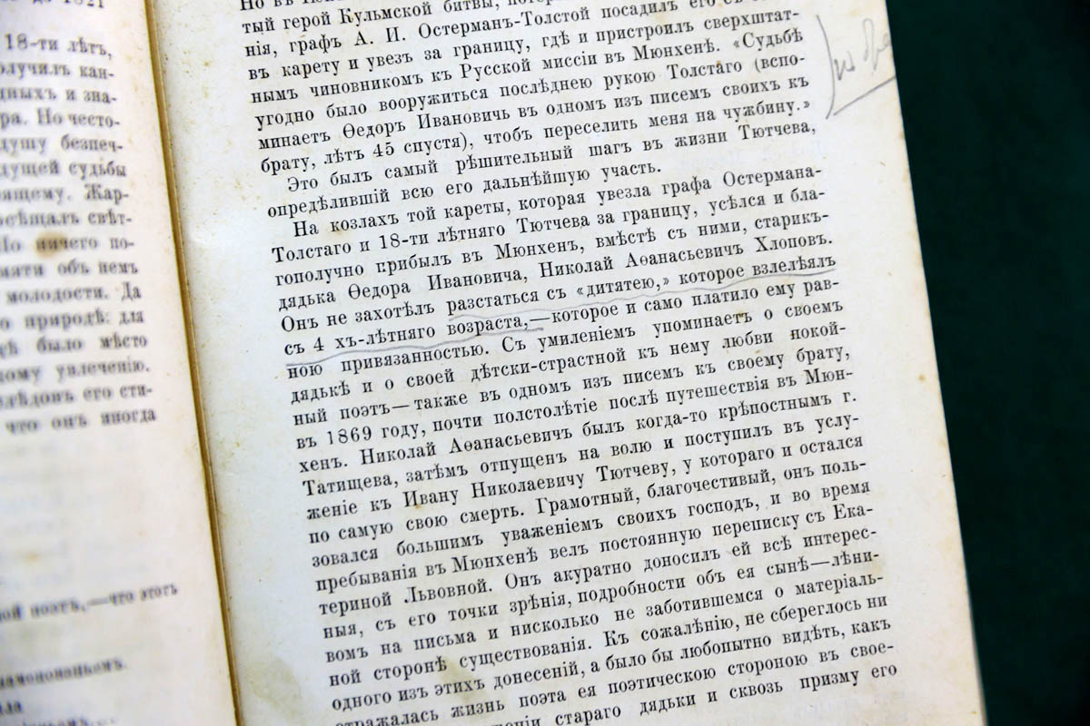 Пометы и подчёркивания Валерия Брюсова в книге: Аксаков И. С. Биография Ф. И. Тютчева. Москва, 1886