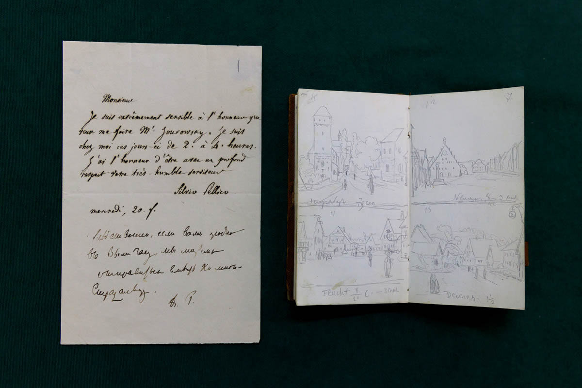 Справа: Дорожная книжка Василия Жуковского с записями и рисунками, сделанными во время путешествия по Германии и Италии. 1839