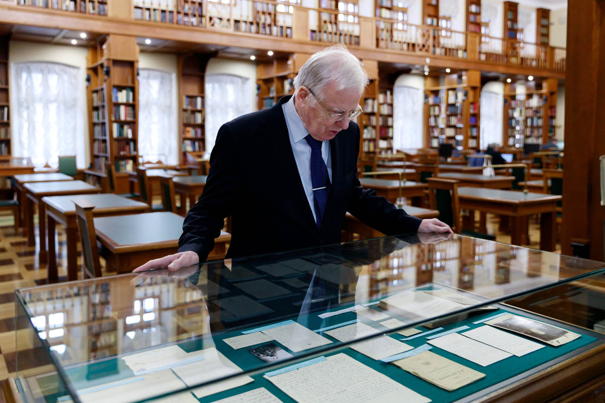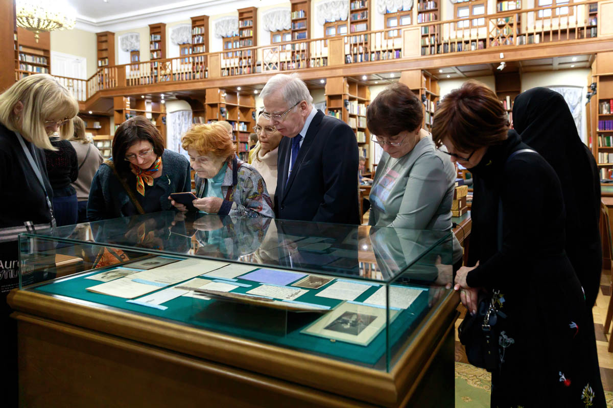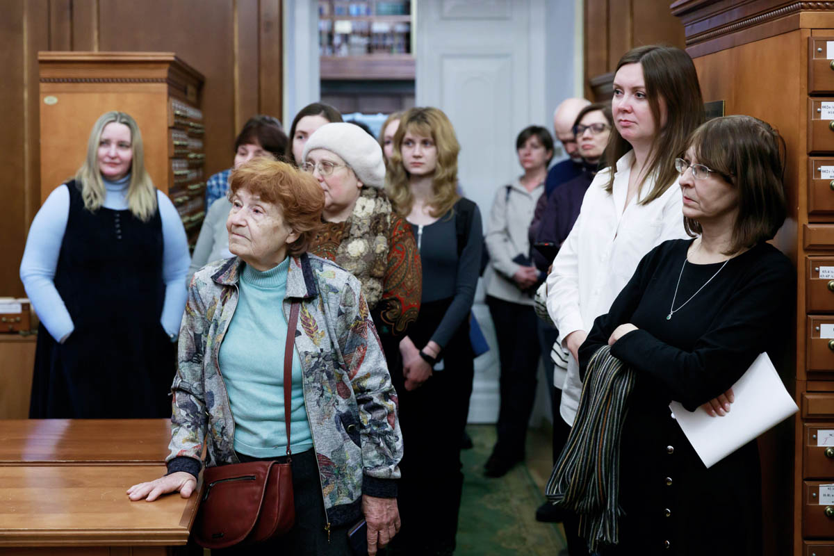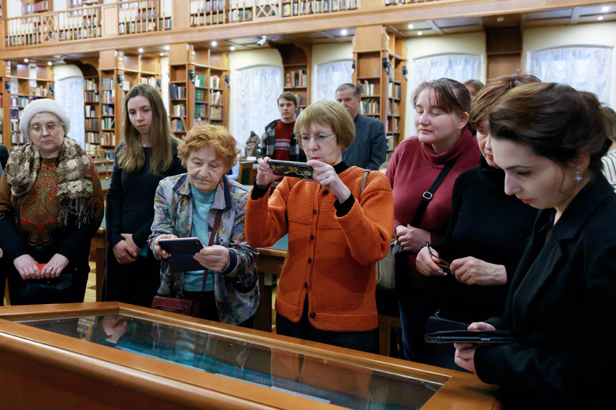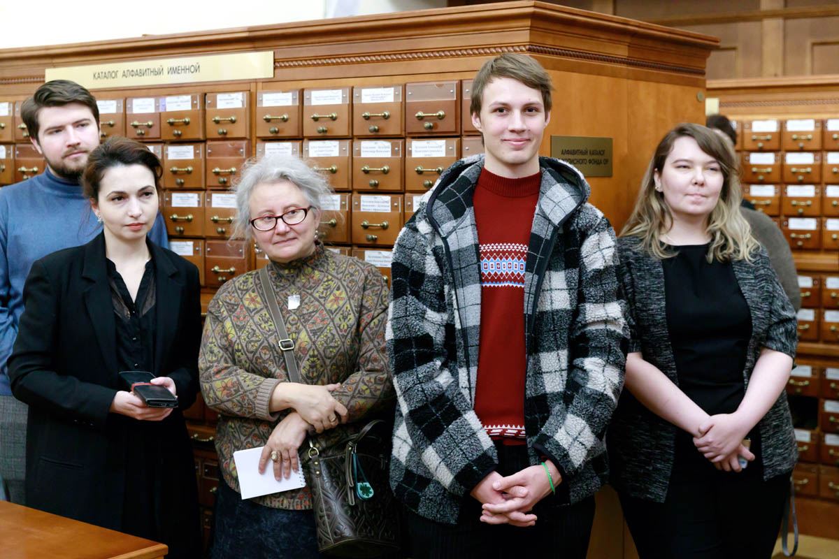 Библиотекарь отдела рукописей РГБ Мария Татаркина, практикант отдела рукописей, студент 4-го курса Московского государственного лингвистического университета Максим Ларин, сотрудники отдела рукописей и гости РГБ на открытии выставки