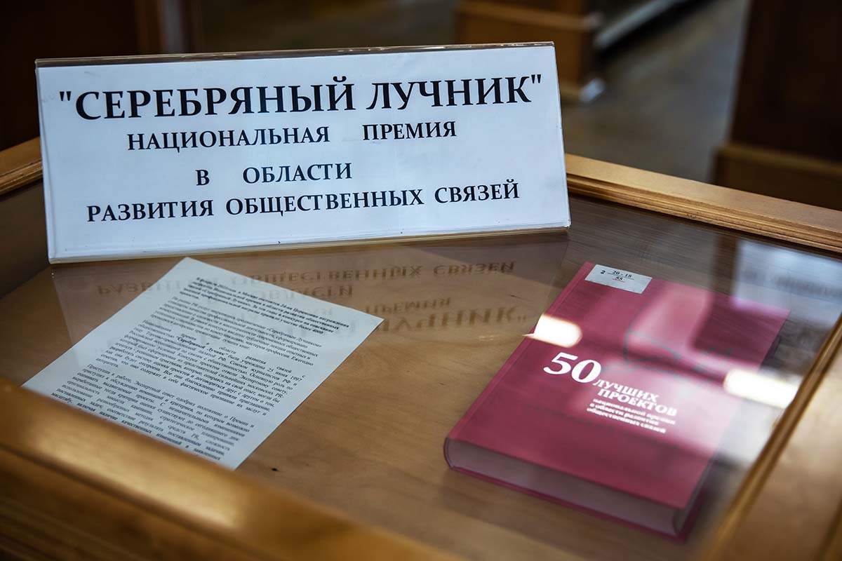 Один из экспонатов — 11-й том из серии «50 лучших проектов Национальной премии в области развития общественных связей „Серебряный лучник“». Это уникальное издание — сборник практических кейсов, лучших проектов из всех российских регионов, США и Чехии, источник ценной профессиональной информации, позволяющий оценить спектр применения всех известных инструментов и технологий.