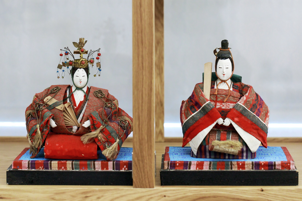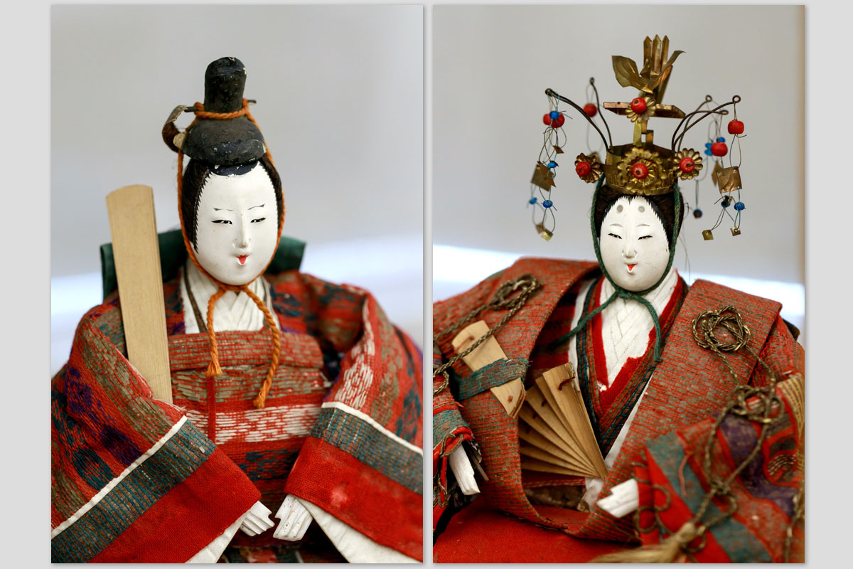 Особый интерес вызывают куклы, созданные в эпоху Тайсё (1912–1926). Наряды императора и императрицы, сшитые из простых шерстяных тканей, лишены привычной шёлковой роскоши: выцветшие края, потёртости и шероховатости говорят о годах, прожитых в тени семейных алтарей, и о бережном хранении.