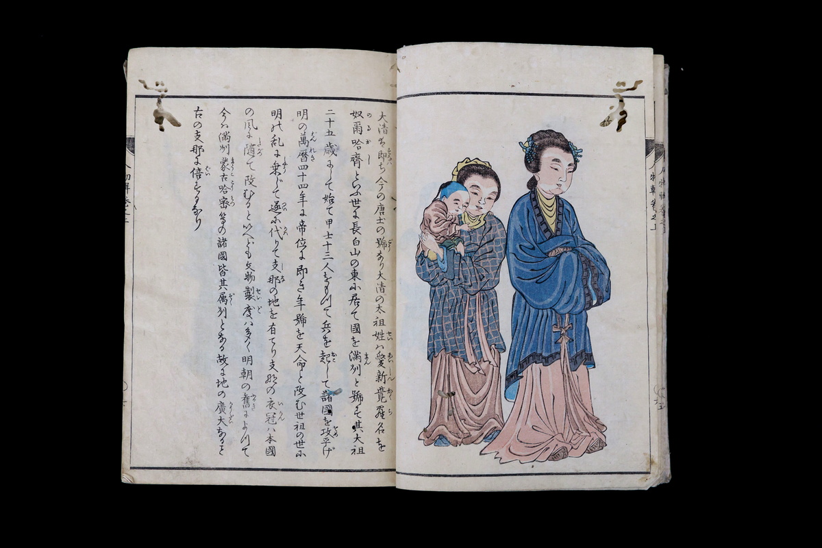 Разворот книги «Описание различных народов мира, написанное Нагатой Нанкэем, ики Иккосай» (Япония, 1854, на японском языке)