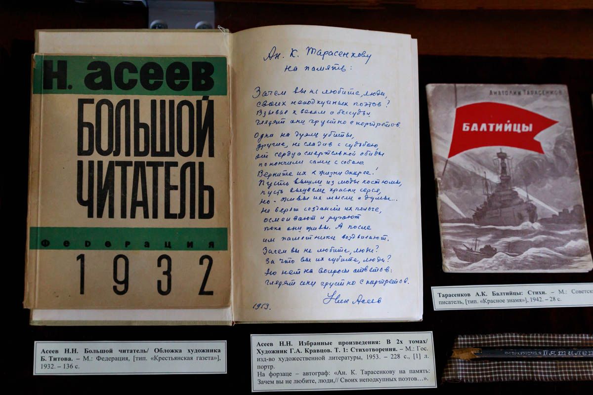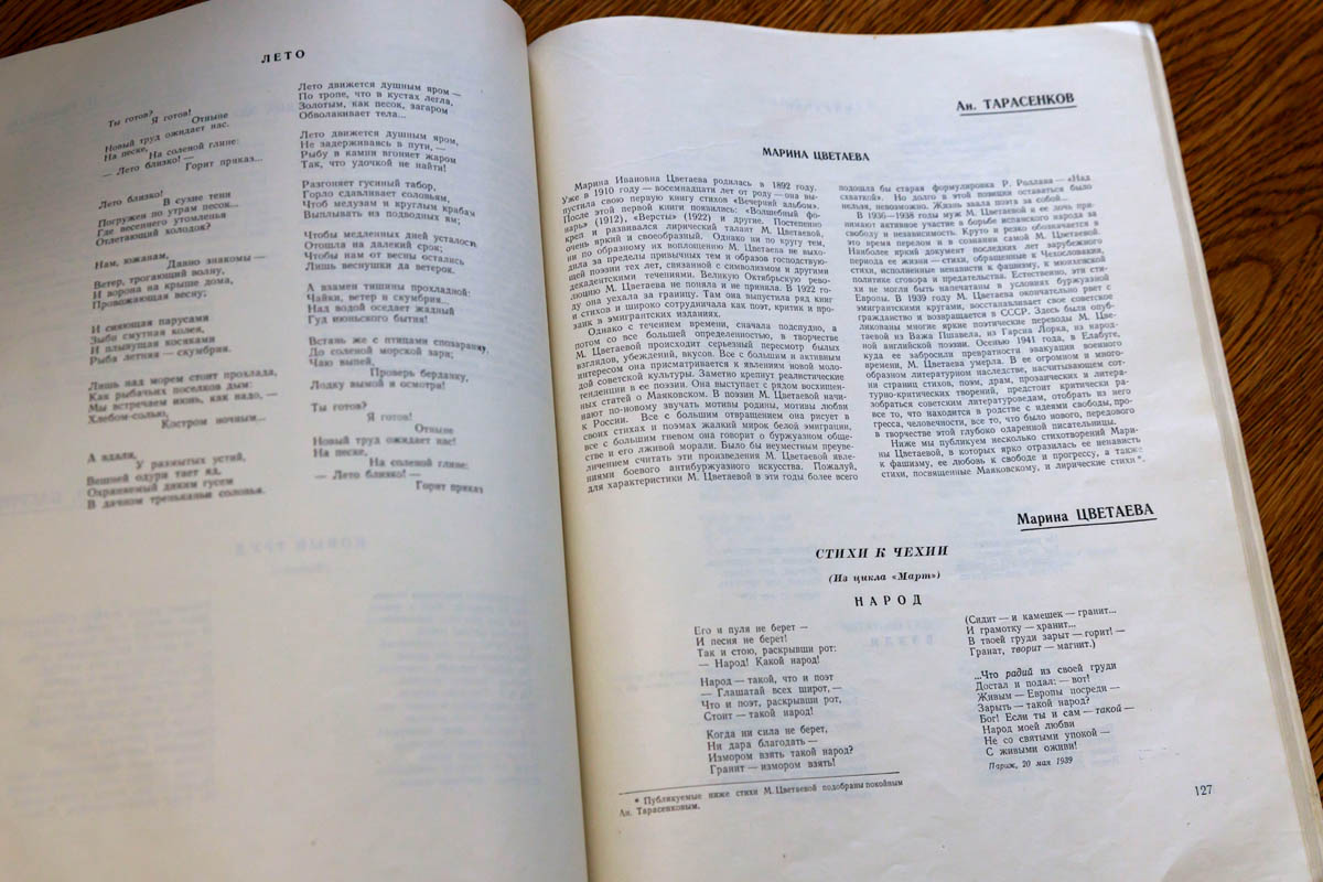 Анатолий Тарасенков был близко знаком с Мариной Цветаевой и её сыном Георгием. В 1955—1956-е годы работал над первым в СССР сборником стихов Цветаевой, который вышел в 1961 году, подготовил к публикации первую в годы оттепели подборку её стихов. Сборник «День поэзии» 1956 года можно увидеть в разделе «Великие книги» основной экспозиции Музея .